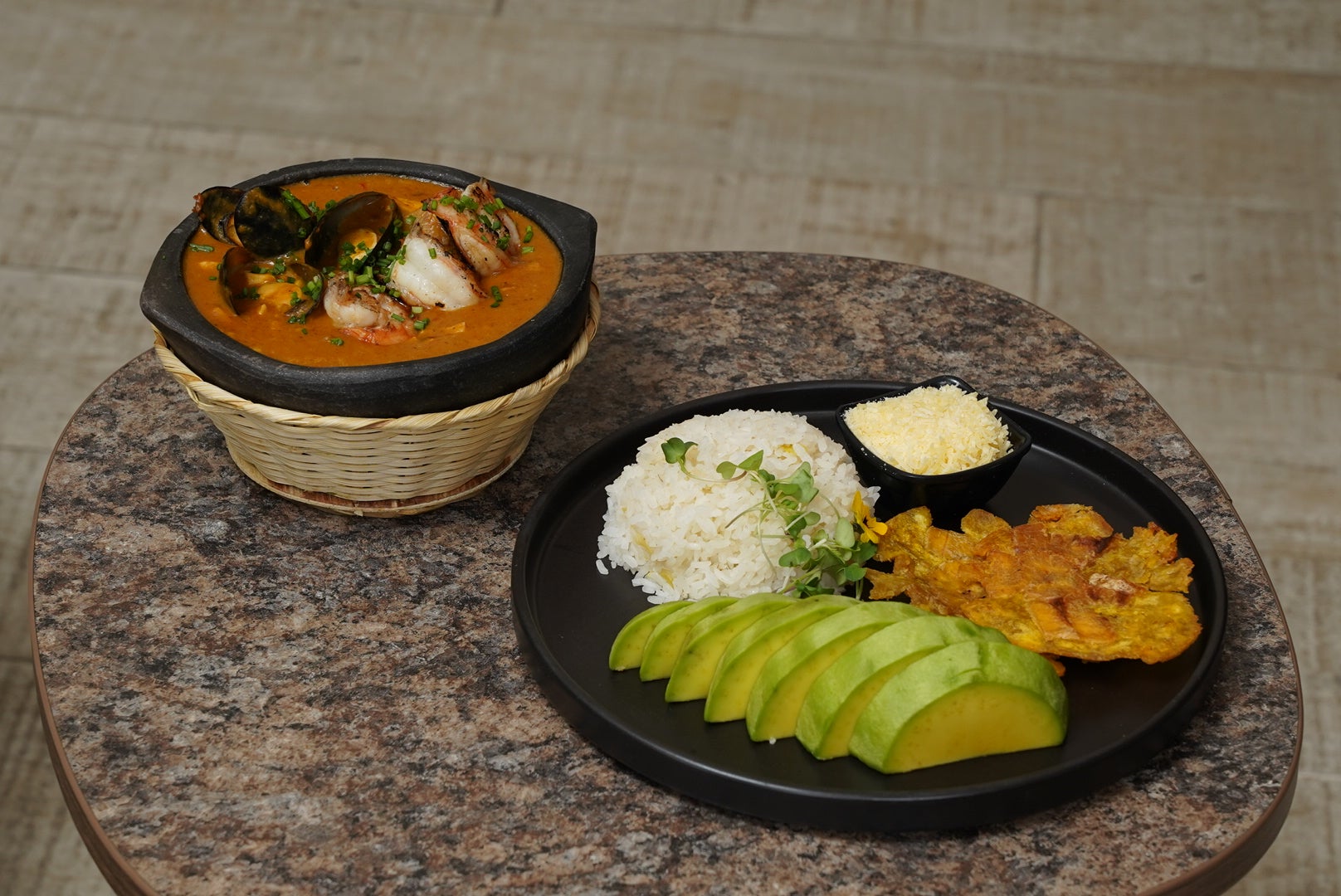 Es preparada con una crema bisqué de mariscos espesada con chontaduro; viene con pescado blanco, camarones, calamares, langostinos, mejillones y palmitos, arroz blanco y patacones; ofreciendo un deleite de sabores marinos.