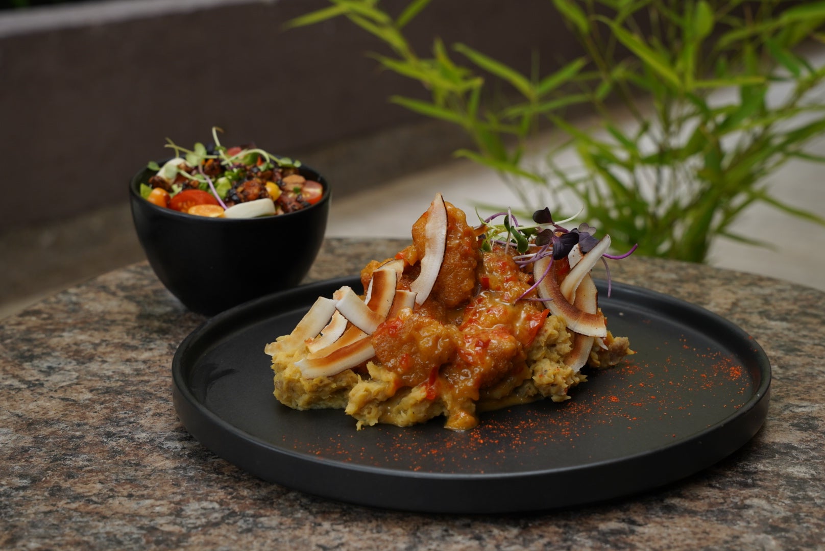 Es un filete de róbalo marinado en especias caribeñas y empanizado con panko crujiente; se baña en una salsa de coco y vegetales con un toque de panela. El plato viene con una boronia, puré de plátano pintón con berenjena.