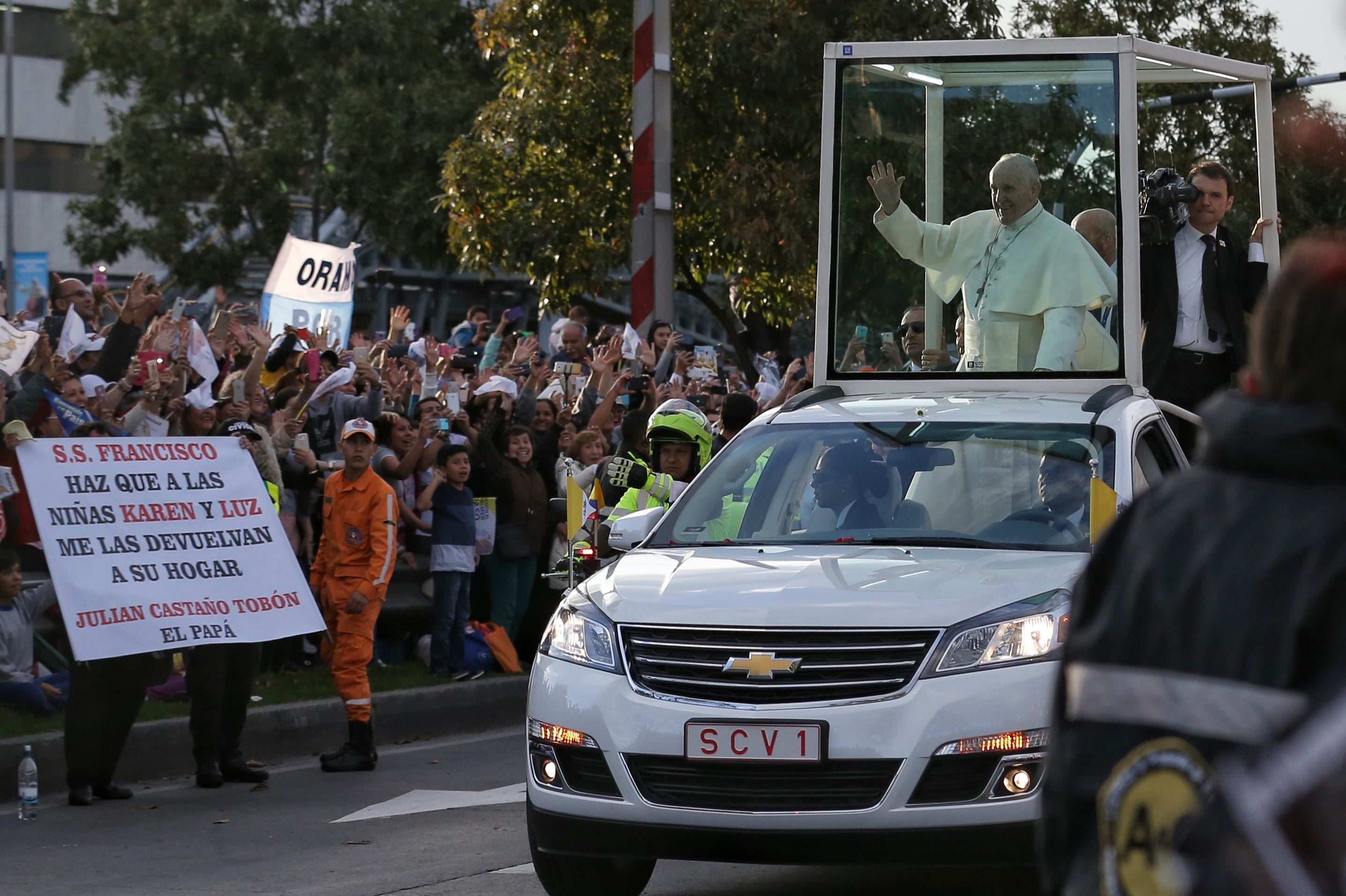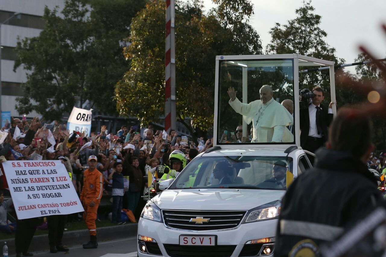 Desde su salida del aeropuerto de Catam se han congregado miles de personas a los costados de esta importante vía de Bogotá, saludándolo y dándole la bienvenida con las banderas de Colombia y pañuelos blancos.
