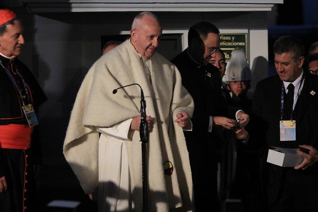 Foto: BOGOTÁ. 6 de septiembre de 2017. El Papa Francisco descendió del avión sobre las 4:36 de la tarde en Catam e inició un saludo protocolario al Gobierno de Colombia. (Colprensa-Mindefensa)