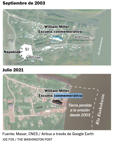 "El río Kuskokwim ha estado carcomiendo Napakiak durante décadas. La comunidad está acostumbrada a regresar las casas cuando el agua se acerca demasiado. Pero la escuela es demasiado grande para moverse y el río se acerca demasiado rápido, acelerado por el cambio climático", señala la historia, que además explica, basada en varios estudios de erosión, como esta región se calienta dos veces más rápido que el resto del mundo, por lo que pierde terreno tres veces más rápido, que lo que pasaba hace una década.