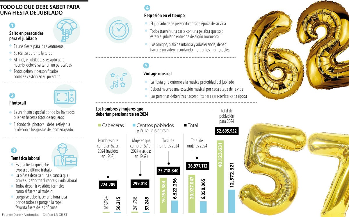 Este año se espera que alrededor de 523.222 personas cumplan su edad de pensión, según datos del Dane. Así que todas ellas tendrán en este 2024, si logran la pensión, un motivo más de celebración: la culminación de su etapa laboral y el inicio de una época de más tranquilidad y disfrute por lo trabajado. Según la ley, serán los hombres de 62 años de edad y las mujeres de 57, los que estarían aptos para retirarse definitivamente de sus trabajos.