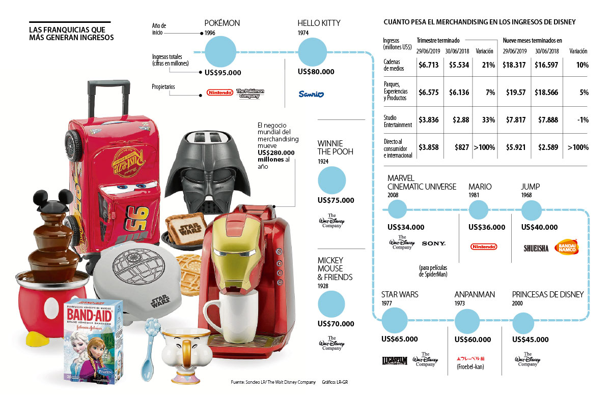 En este universo de merchandising, que mueve unos US$280.000 millones anuales, la franquicia que ha generado los mayores ingresos desde su creación ha sido precisamente la que tiene a Pikachu como uno de sus personajes principales: Pokémon, con una facturación de unos US$95.000 millones. Hello Kitty, propiedad de Sanrio, ha generado unos US$80.000 millones desde su origen, en 1974, lo que le dio el segundo lugar en el listado.