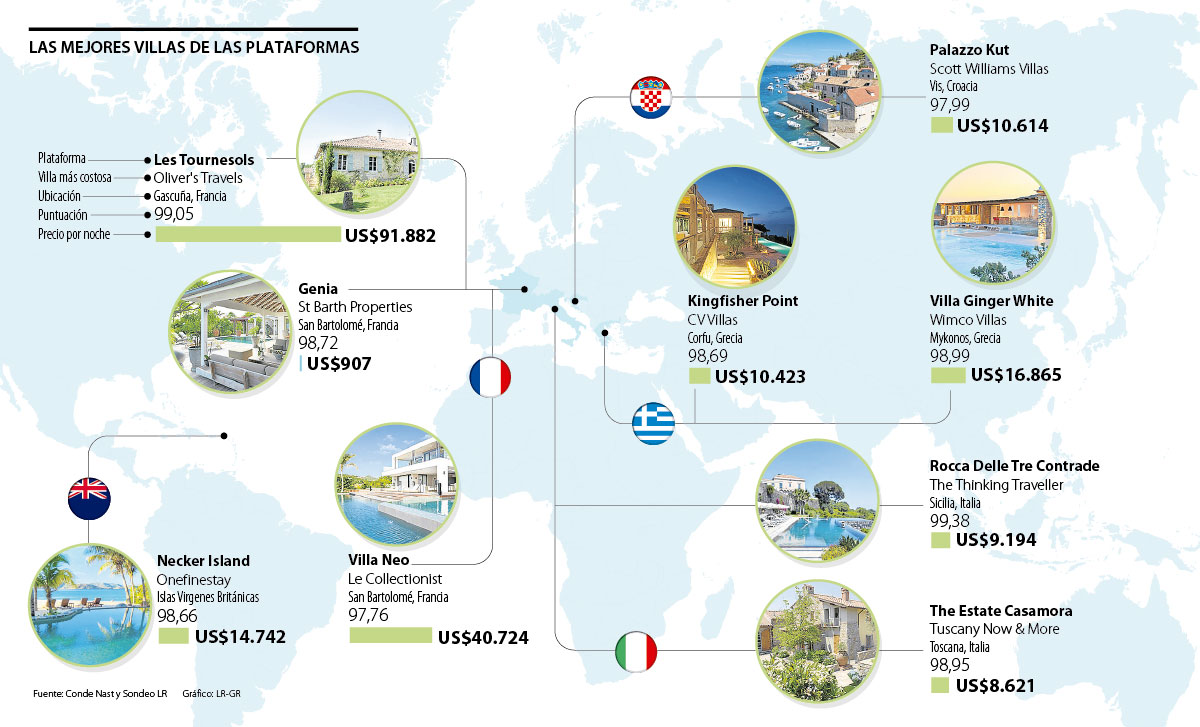 La revista de viajes Condé Nast Traveller hizo una lista a partir de las votaciones de sus lectores y clasificó cuales eran las mejores plataformas para reservar uno de estos exclusivos espacios. El primer lugar fue para The Thinking Traveller, el segundo para Oliver’s Travels y continúan la lista Wimco Villas, Tuscany Now & More, St Barth Properties, CV Villas, Onefinestay, Scott Williams Villas y Le Collectionist en el puesto 10.