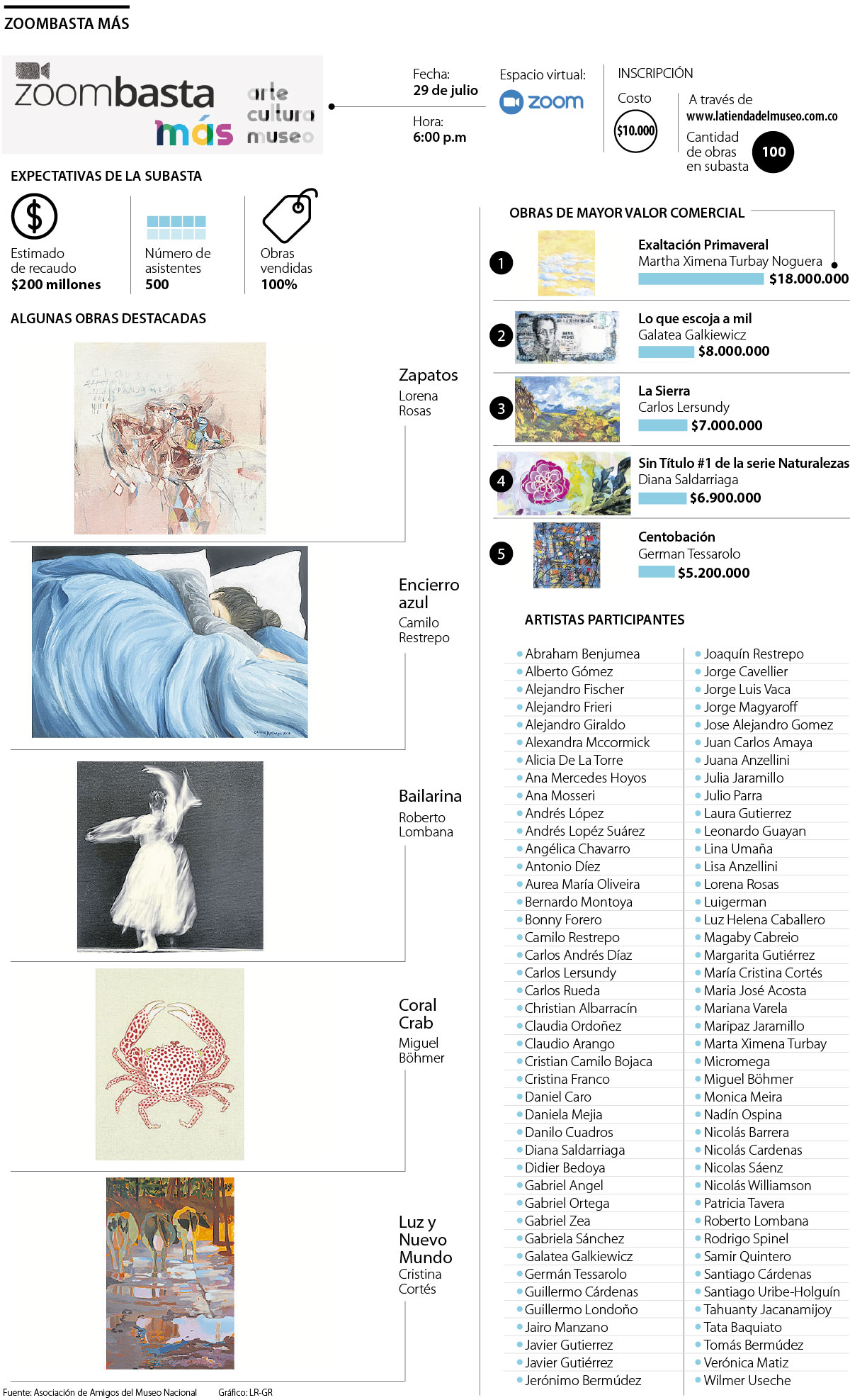 Para pujar por los 100 lotes subastados o para apoyar al museo con la asistencia, se debe ingresar a latiendadelmuseo.com.co y pagar $10.000; los inscritos recibirán un código de puja que los acredita como ‘zoombastadores’, el enlace de acceso a Zoom, el catálogo con la ficha técnica de cada lote y los pasos a seguir para tener una velada que promete ser emocionante y que va a estar moderado por los martillos, Diego Carvajal, María Camila Díaz y Andrea Jaramillo.