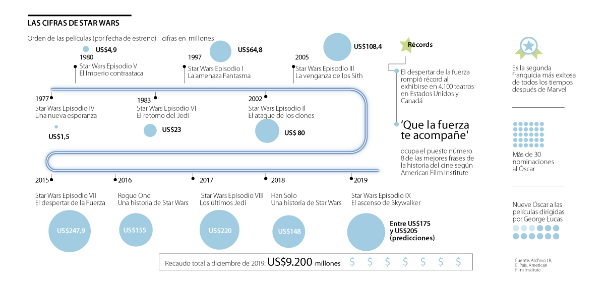 Con un universo cinematográfico que congrega a millones de fanáticos alrededor de personajes como Darth Vader y la Princesa Leia o los más nuevos como Rey y Kylo Ren, entre muchos otros, Star Wars es la segunda franquicia de mayor recaudación con US$9.200 millones según Reuters. Esto, sin contar con el recaudado previsto de la última película que se estrenará en el país el 19 de diciembre.