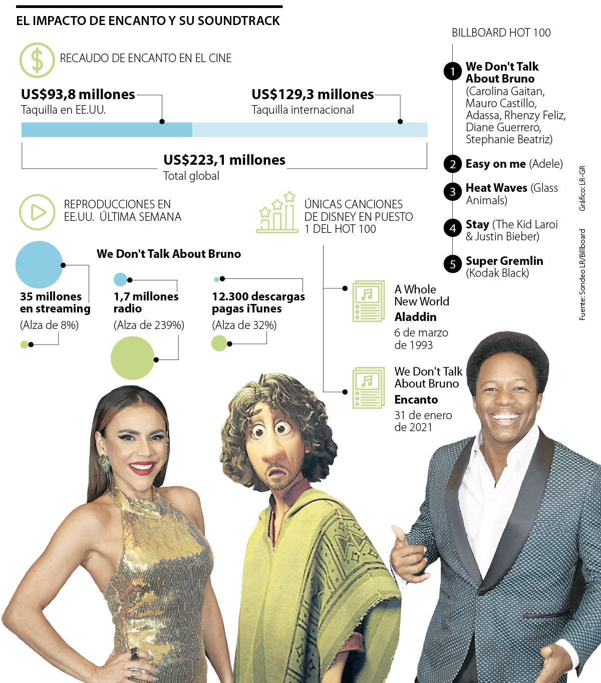 Bruno gobierna el Hot 100 en su quinta semana en la lista, luego de debutar en el puesto 50 en la encuesta del 8 de enero. Hay que recordar que Encanto llegó el 24 de diciembre a Disney+, luego de su estreno el 24 de noviembre. Es decir, va para su tercer mes en el que Encanto, una película que ha recaudado US$223 millones, sigue estando vigente ahora por su música.