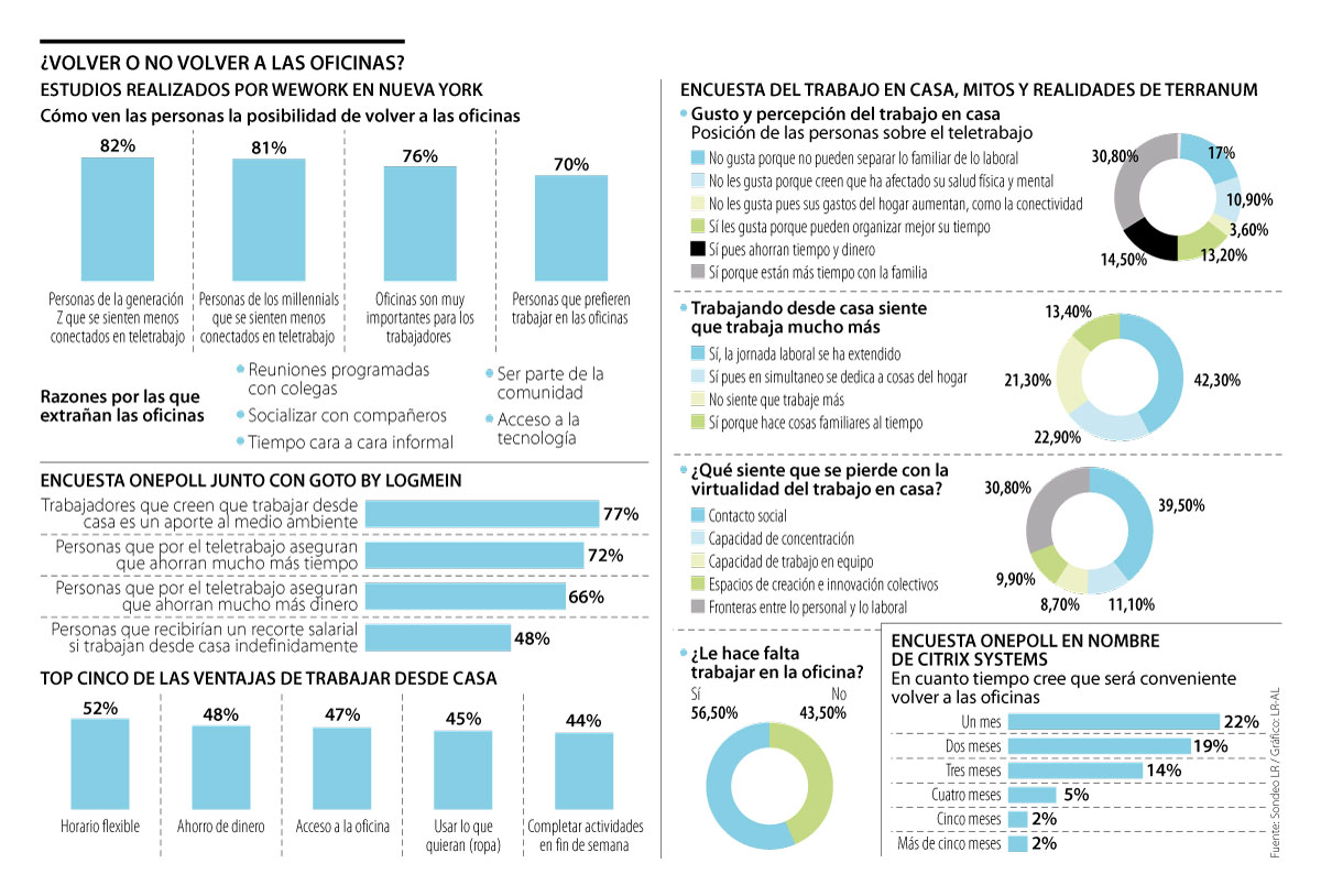 Un estudio similar hecho por Terranum en Colombia dejó ver que a 56,5% de las personas le hacía falta trabajar en las oficinas por el contacto social (39,5%), la capacidad de concentración (11,1%), capacidad de trabajo en equipo (8,7%), espacios de creación e innovación colectivos (9,9%) y fronteras entre lo laboral y lo personal, que se tienden a perder en la casa (30,8%). Sin embargo, cuando se preguntó si les gustaba o no el teletrabajo 58,5% respondió que sí, por lo que los expertos han señalado que se ve una tendencia a la mayor flexibilización, donde no solo se pueda escoger qué modalidad funciona más para el empleado y la empresa, sino también donde las jornadas sean mixtas.