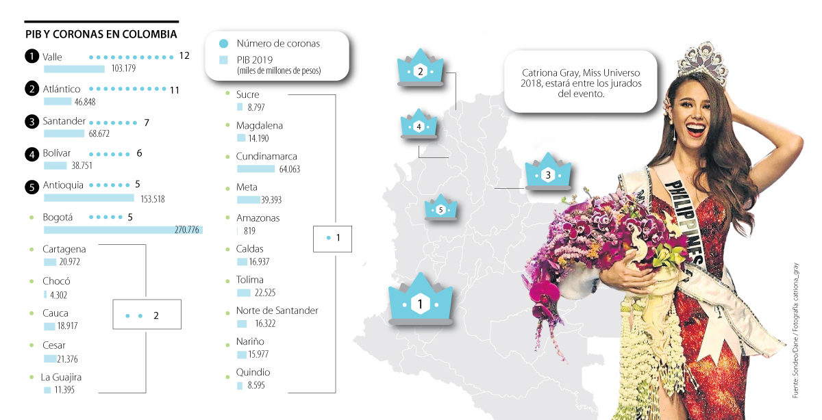 Las regiones con el PIB más alto del país son a su vez las que tienen más coronas en el tradicional concurso que premia a la mujer más bella de Colombia. Estas seis zonas, que tienen 64% del PIB local, buscarán que su representante se quede este lunes con el título de Miss Universe Colombia 2021.