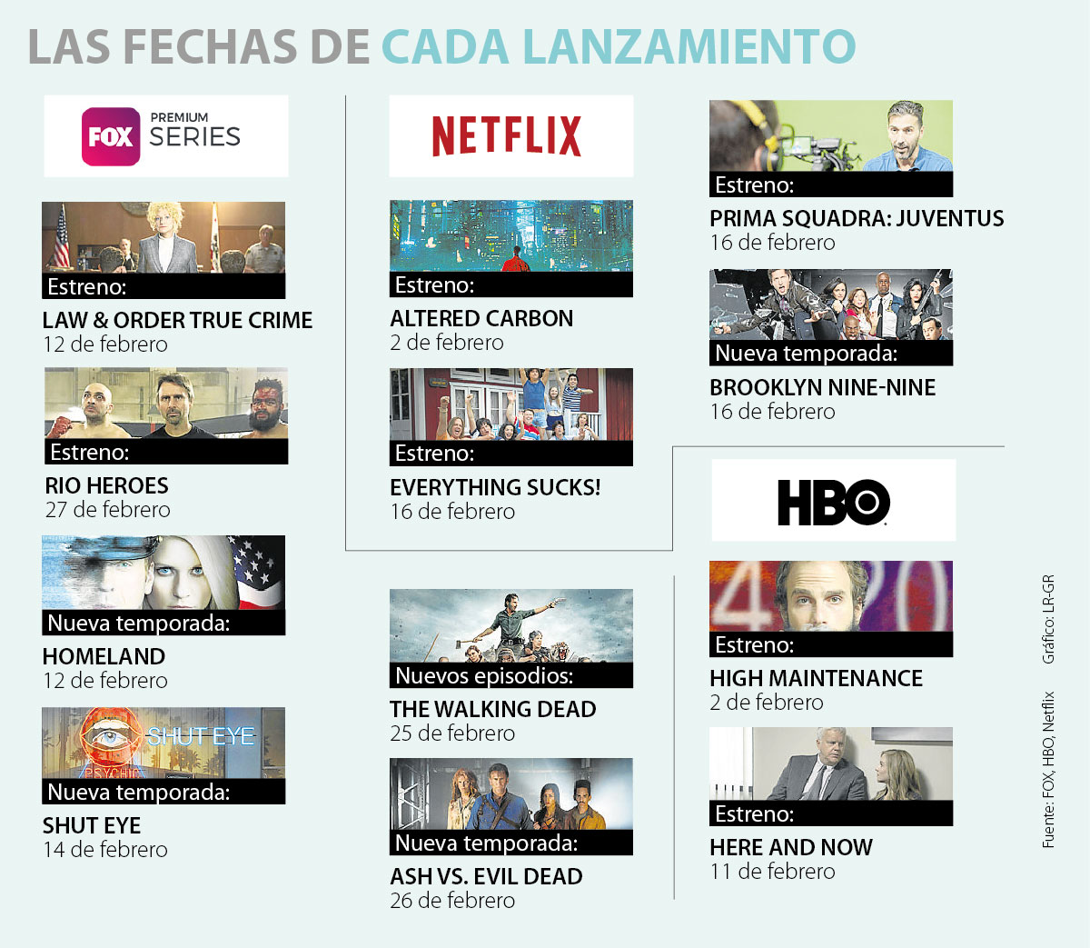Durante febrero cada firma estrenará al menos dos producciones, entre las que se destacan Law & Order True Crime y Rio Heroes de FOX, High Maintenance y Here and Now de HBO o Altered Carbon y Everything Sucks! de Netflix.