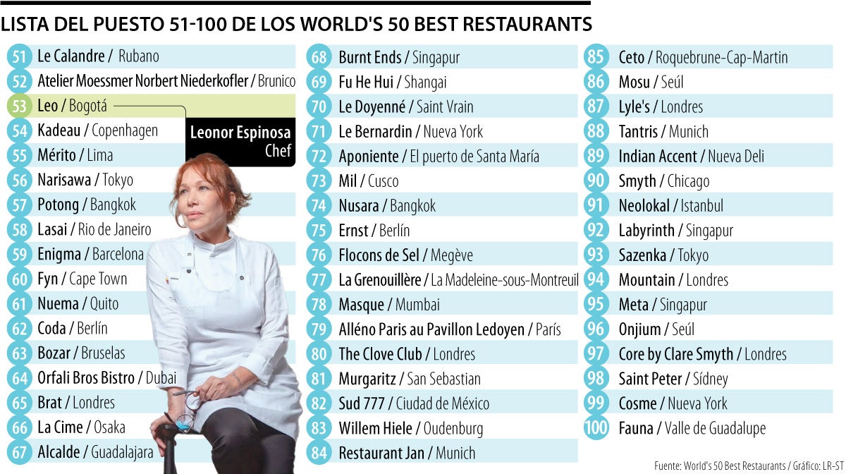 Ayer, en una ceremonia que tuvo lugar en Las Vegas, Nevada, se dieron a conocer los restaurantes entre los puestos 51 a 100. Leo, el establecimiento de la chef colombiana Leonor Espinosa y la sommelier Laura Hernández se ubicó en el puesto 53 a nivel mundial, logrando mantenerse por sexto año consecutivo en la lista de los 100 mejores del mundo. Sin embargo, descendió 10 puestos en el ranking de este año, saliendo así de los primeros 50.