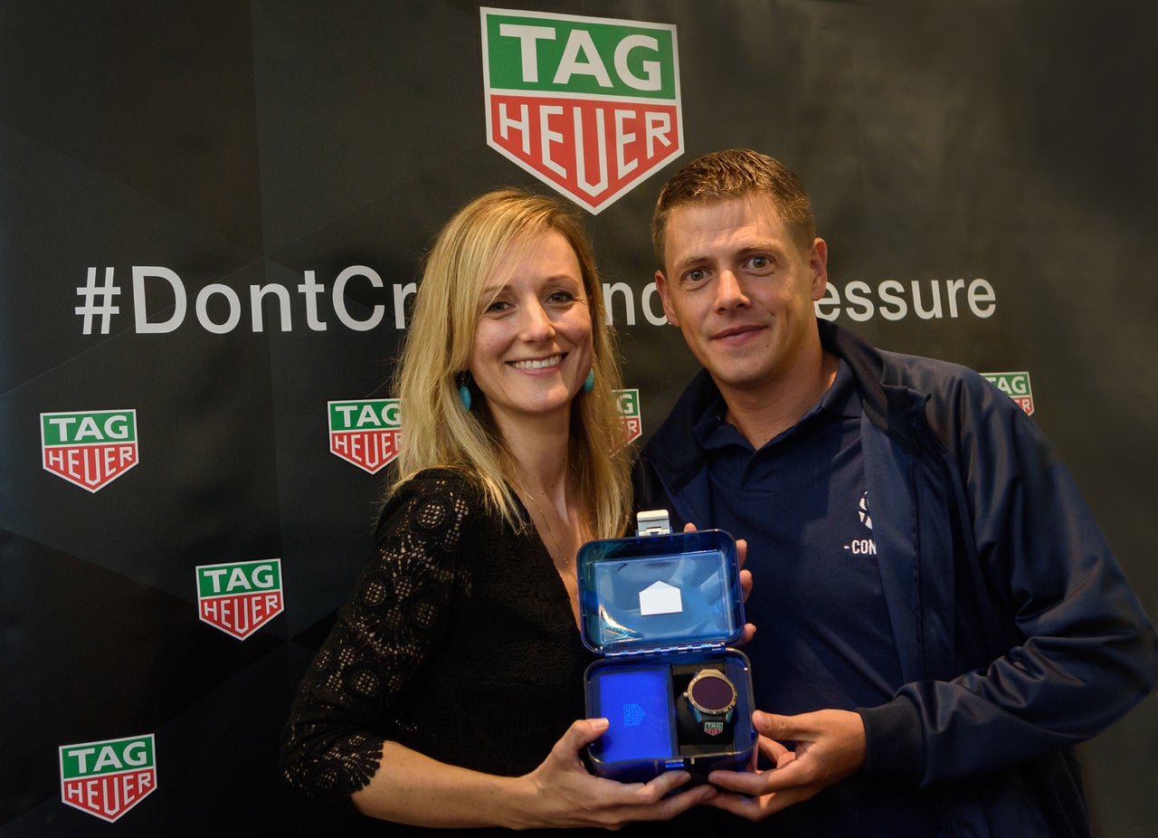 Veronique Fauchere, directora de marketing de América Latina de TAG Heuer, acompañada de German Delfino, árbitro de primera división.