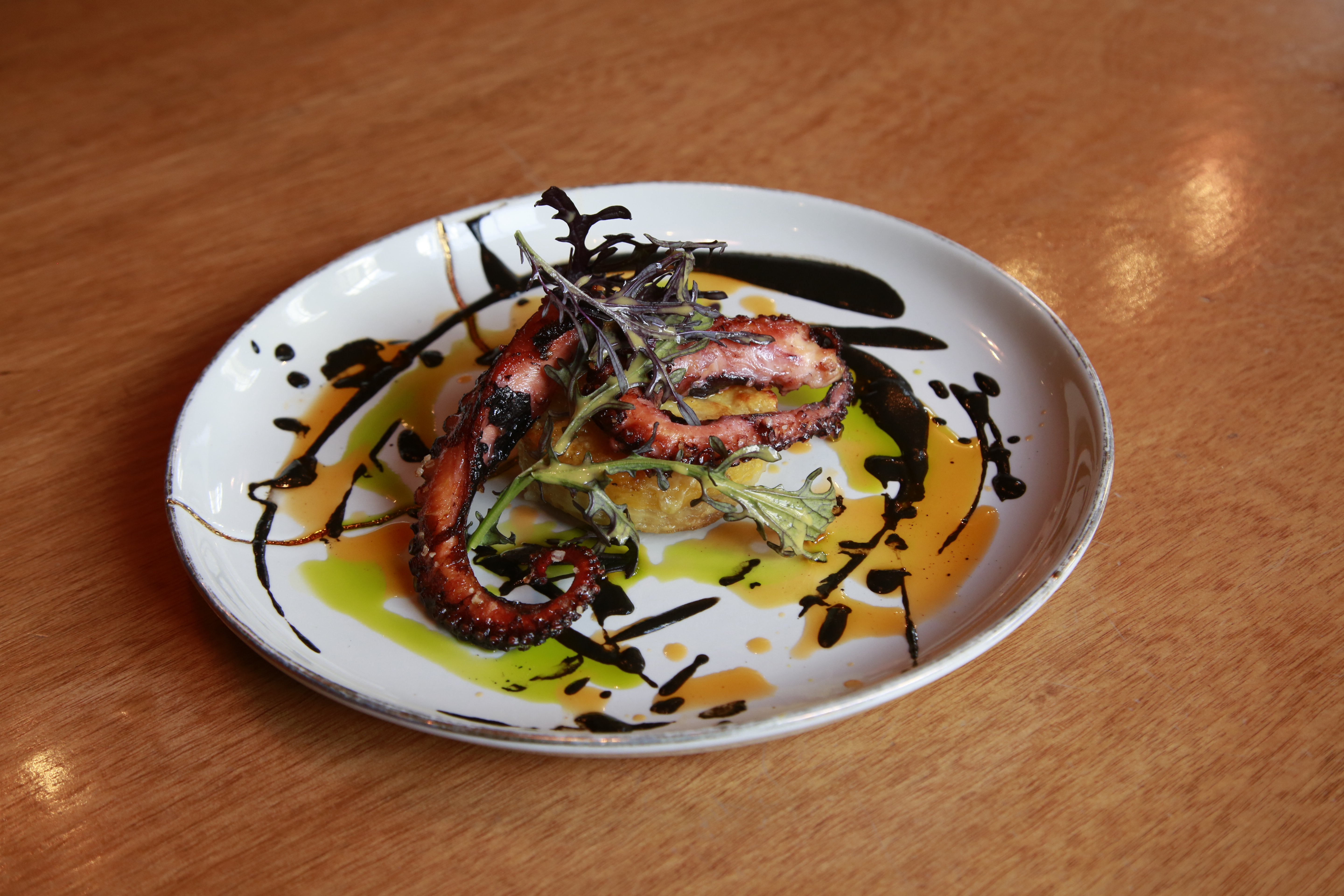 Preparación que se centra en la cocción lenta de los tentáculos del pulpo, que se ponen al fuego durante 12 horas y luego se sirve sobre un gratín de papas, acompañado de salsa de morrones.