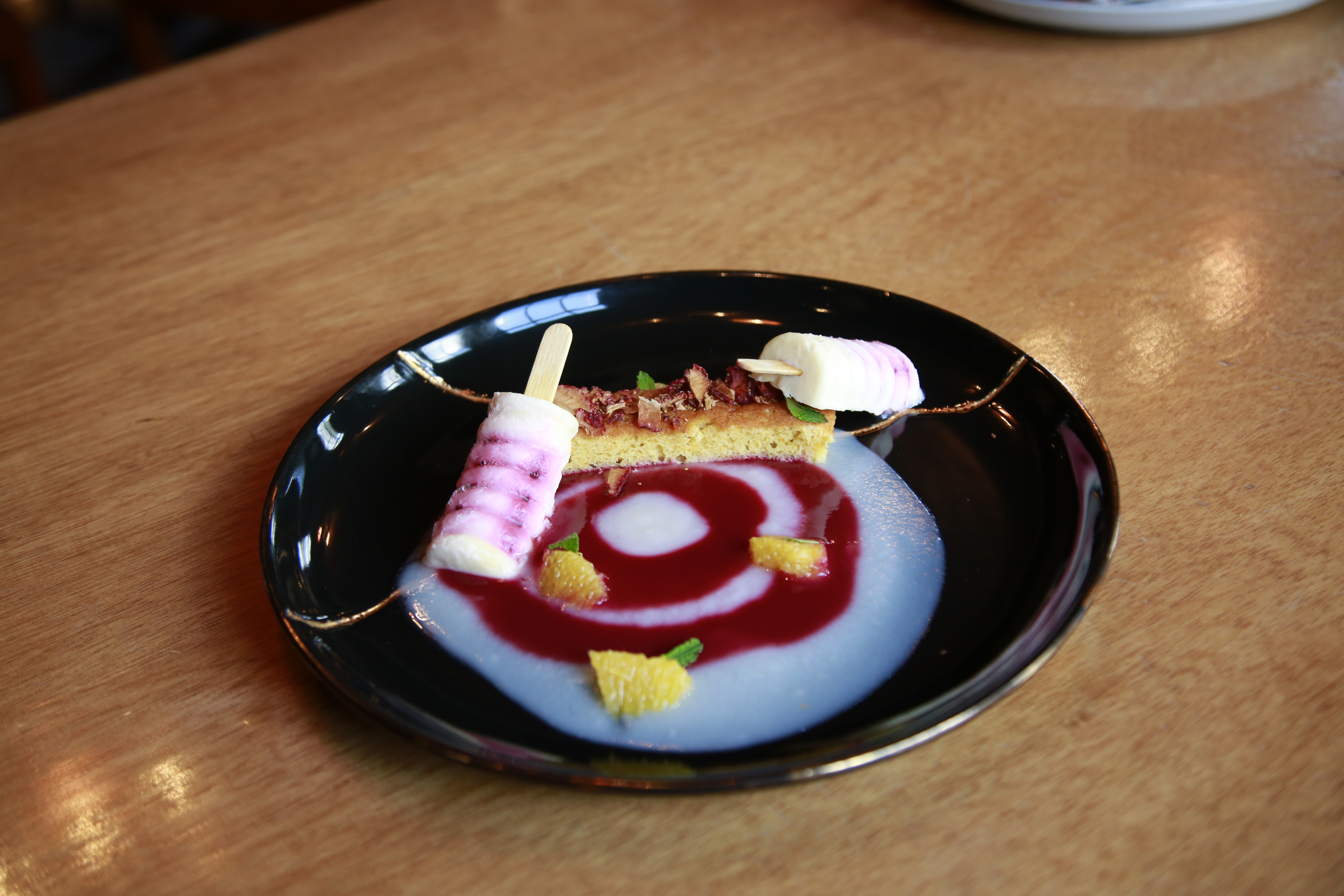 Postre inspirado en el tradicional salpicón de Baudilia, en Popayán, se compone de una paleta de guanábana con centro de mora, bizcocho de naranja, crocantes de fresa y hierbabuena.