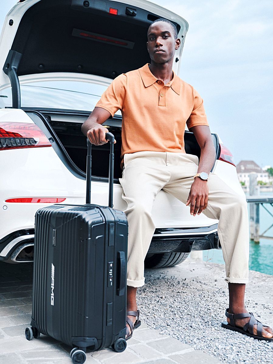 55 cm. Interior con dos separadores extraíbles y compartimento con cremallera. Cintas elásticas. Candado numérico TSA. Cierre de resorte. Asa superior y lateral con detalles en cuero y logotipo AMG estampado. Barra telescópica de 2 piezas con logotipo AMG grabado. 4 ruedas dobles que giran en cualquier dirección con remache de rombo. Made for Mercedes-AMG by Hartmann. Dimensiones: aprox. 40 x 24 x 55 cm; capacidad: aprox. 37,5 l; peso: aprox. 4,8 kg. Precio: 1.292 euros. (US$1.384)