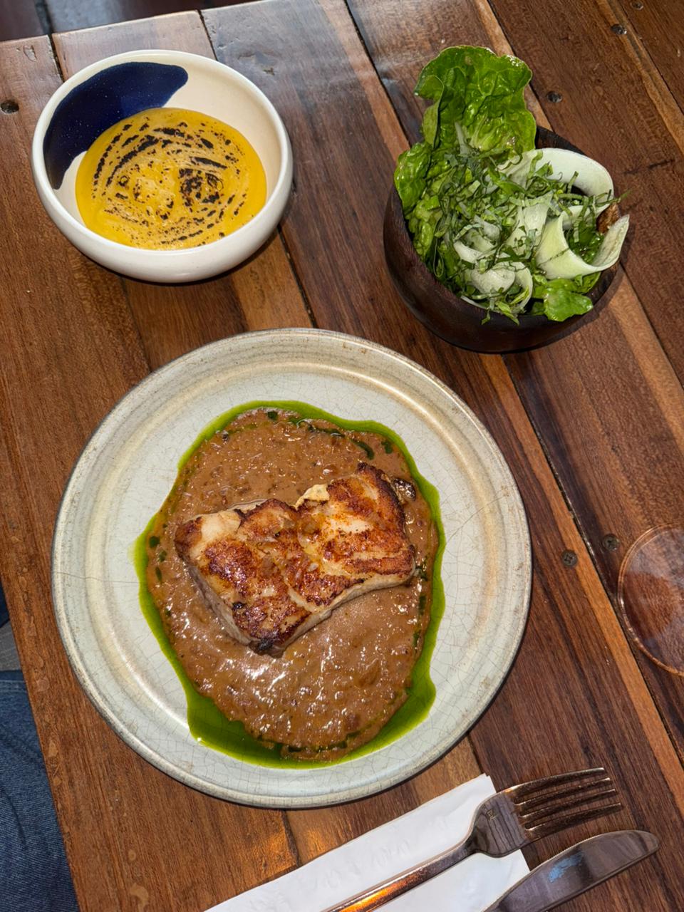Otra opción altamente recomendada es la pesca artesanal del día, que consiste en filete de pescado asado y sazonado con un picadillo de limón preservado, puré de arracacha con ajo confitado, salsa de maní, coco y jengibre, acompañado por una ensalada de cogollos y pepino.
