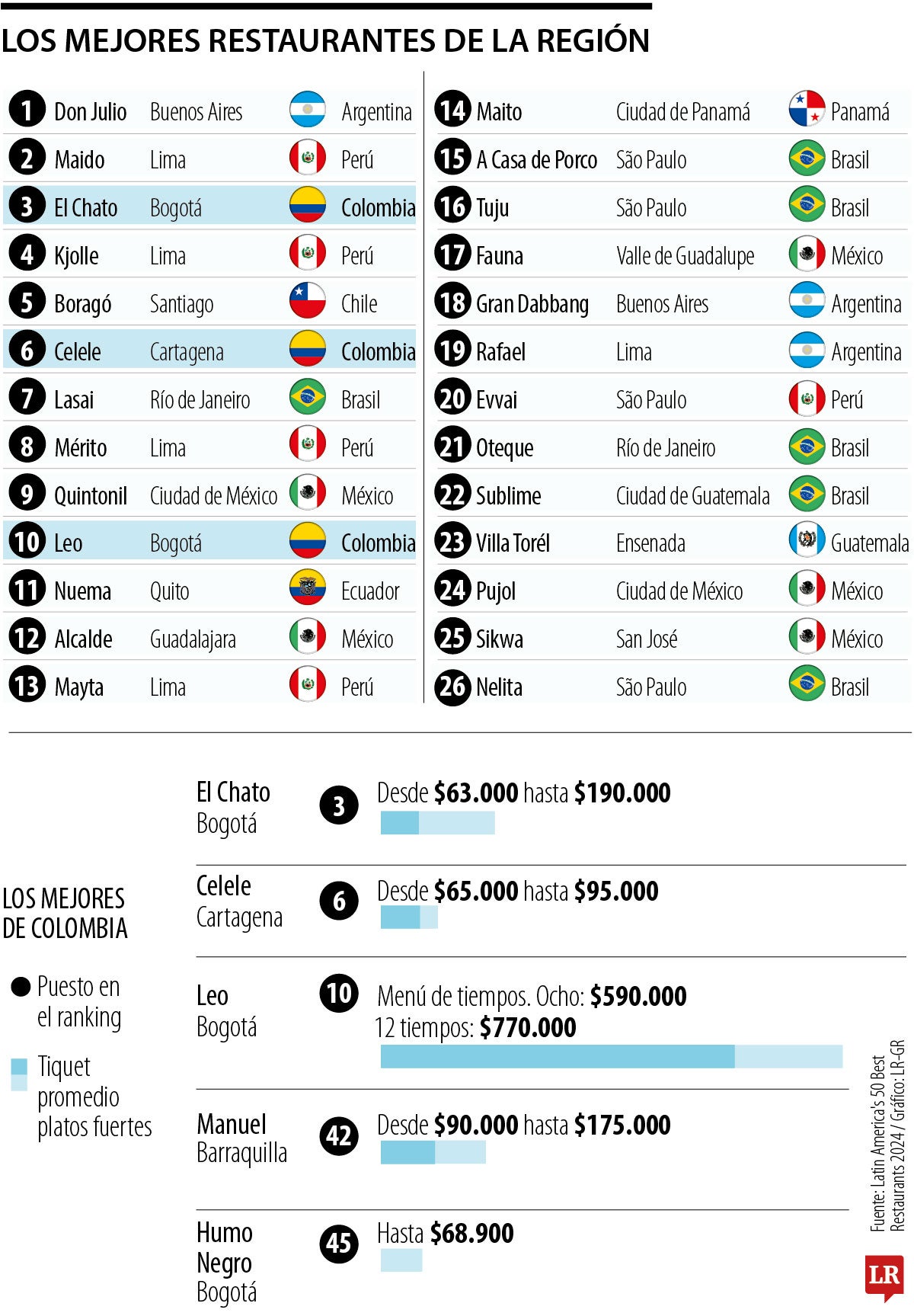 Don Julio, de Argentina, Maido, de Perú, y El Chato, de Colombia, fueron seleccionados como los tres mejores restaurantes de Latinoamérica. También estuvieron otros colombianos como Humo Negro, Celele, Manuel y Leo.