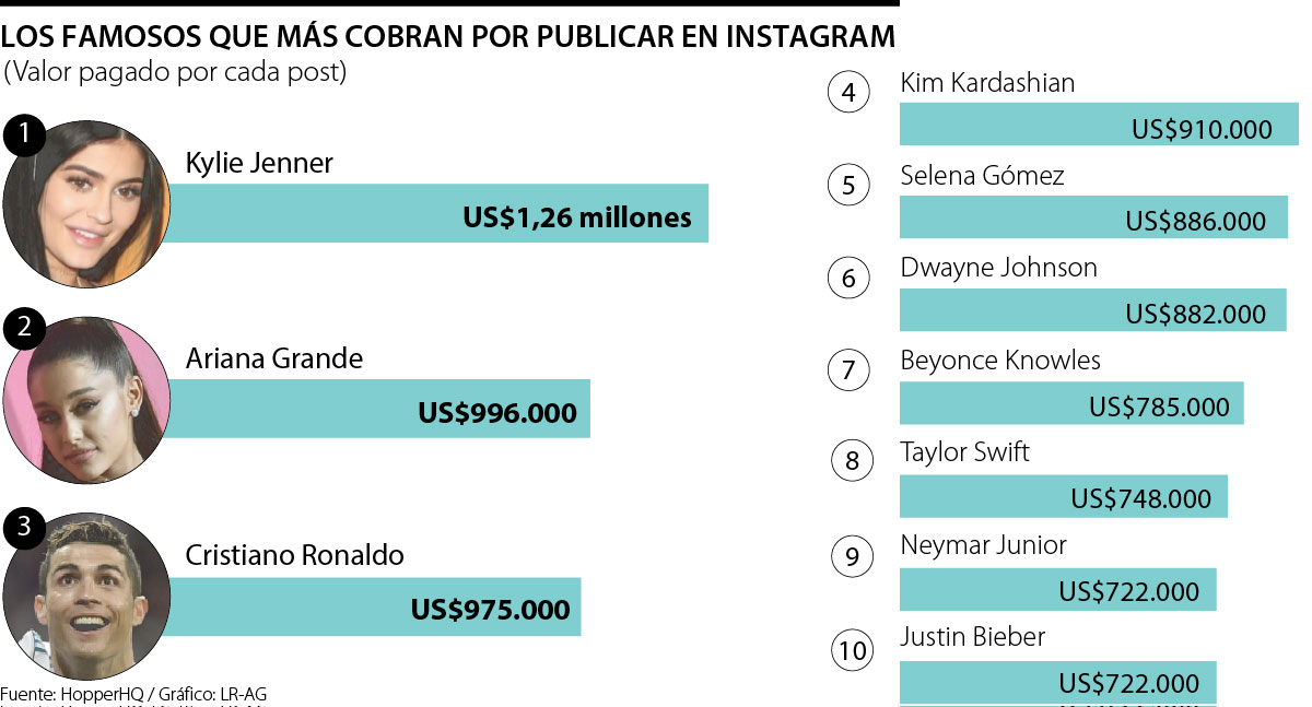 Las dos reinan en el ‘top ten’ de las celebridades que más cobran por realizar un post promocionado en sus redes sociales no están solas, la lista incluye en un tercer lugar al futbolista Cristiano Ronaldo, quien cobra US$975.000 por cada publicación en Instagram.