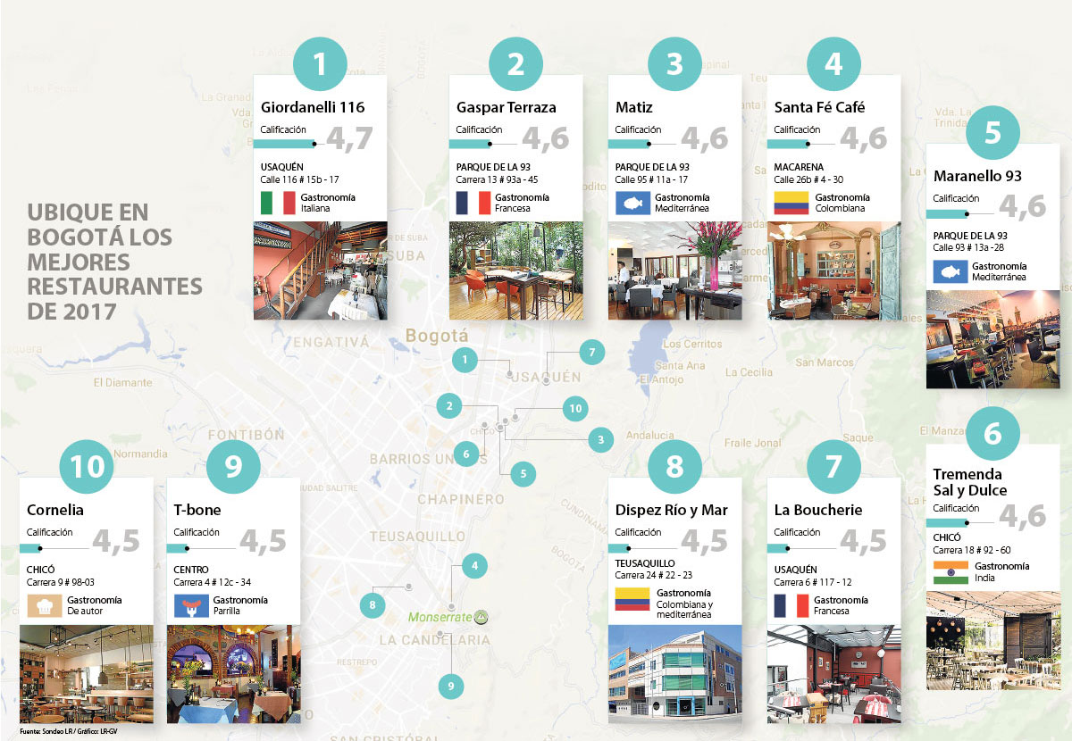 El top 10, producto de este ejercicio en lo que va corrido de 2017, también incluye el comedor de cocina colombiana Santa Fé Café, Maranello 93 y Tremenda Sal y Dulce; además, está La Boucherie, un restaurante de gastronomía francesa ubicado en Usaquén, al norte de la ciudad. Le siguen también Dispez Río y Mar, centrado en comida colombiana fusión con mediterránea; T-bone, un local con una de las mejores parrillas; y Cornelia, una interesante propuesta de cocina de autor en el barrio Chicó.