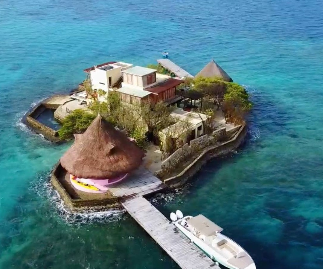 Con nueve camas, este pequeño islote está situado en el parque nacional de las Islas del Rosario y ha sido presentado en Vogue, L’Officiel, TMZ, The Daily Mail UK y House Hunters International. Viene con todo el personal como servicio de limpieza, mayordomo y piloto de barco.