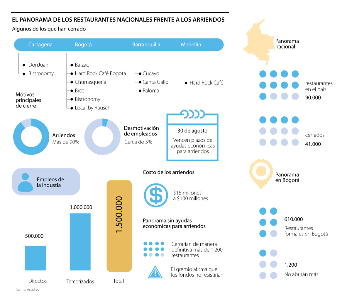 El panorama nacional no es nada alentador, ya que de 90.000 restaurantes en el país, más de 41.000 han cerrado sus puertas y según Acodres en más de 95% de los casos ha sido debido a los arriendos. Si bien varias entidades oficiales, incluidas el Ministerio de Vivienda, han anunciado acuerdos de arriendos en más de 80% de los contratos, esto no cobija en gran medida a los arriendos del sector gastronómico, pues según explica Henrique Gómez, presidente del gremio, los rubros que los restaurantes pagan son muy altos, por lo que en su gran mayoría no se logran conciliaciones.