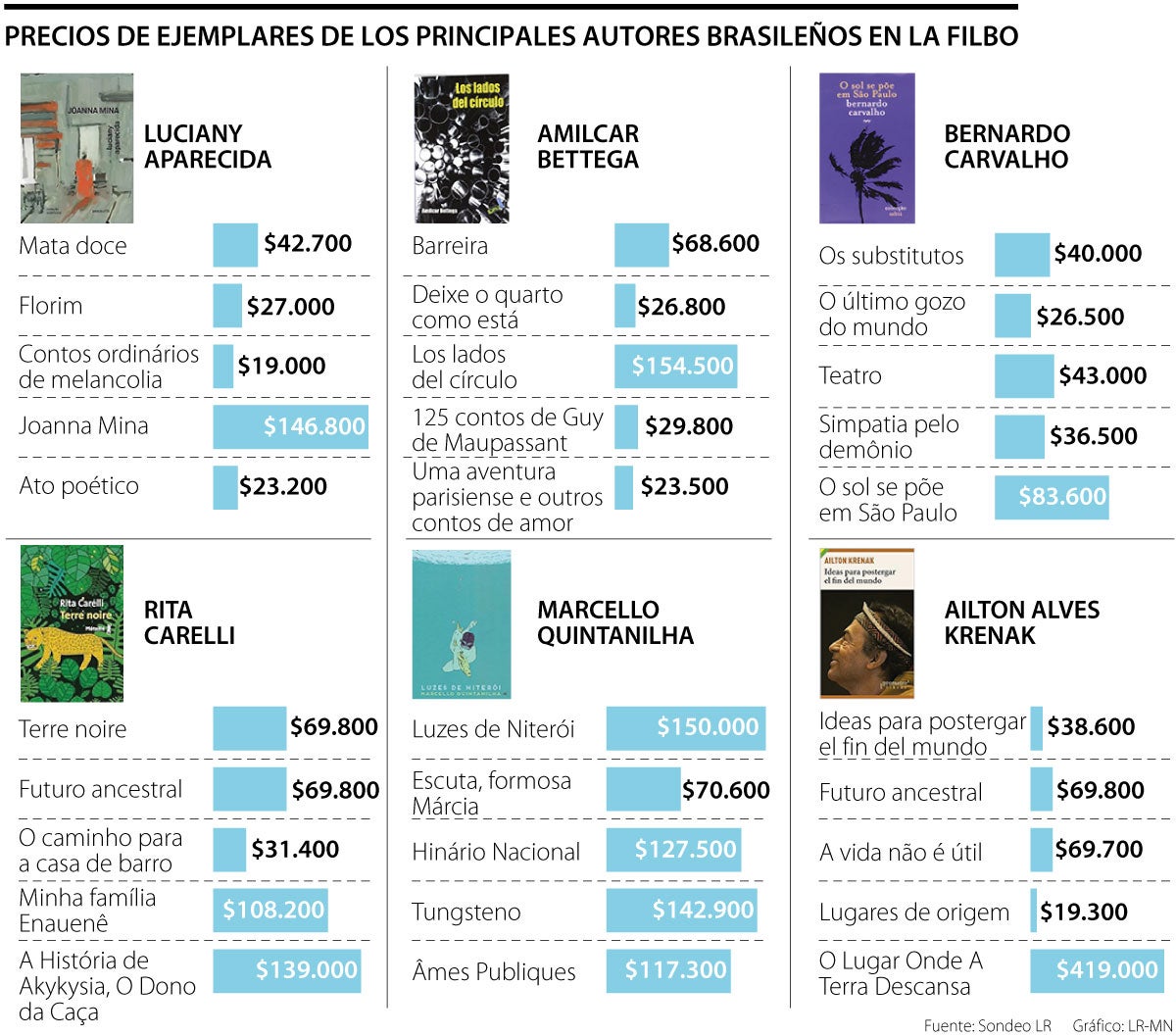 El primero de ellos es Luciany Aparecida, autora de libros como ‘Mata doce’, ‘Forim’, ‘Ato poético’, entre otros; los precios de sus libros oscilan entre $19.000 y $146.800. También hay autores como Amilcar Bettega, quien ha escrito ejemplares como ‘125 contos de Guy de Maupassant’, ‘Barreira’, ‘Deixe o quarto como está’; con este autor, el precio máximo es $154.500 para el libro ‘Los lados del círculo’.
