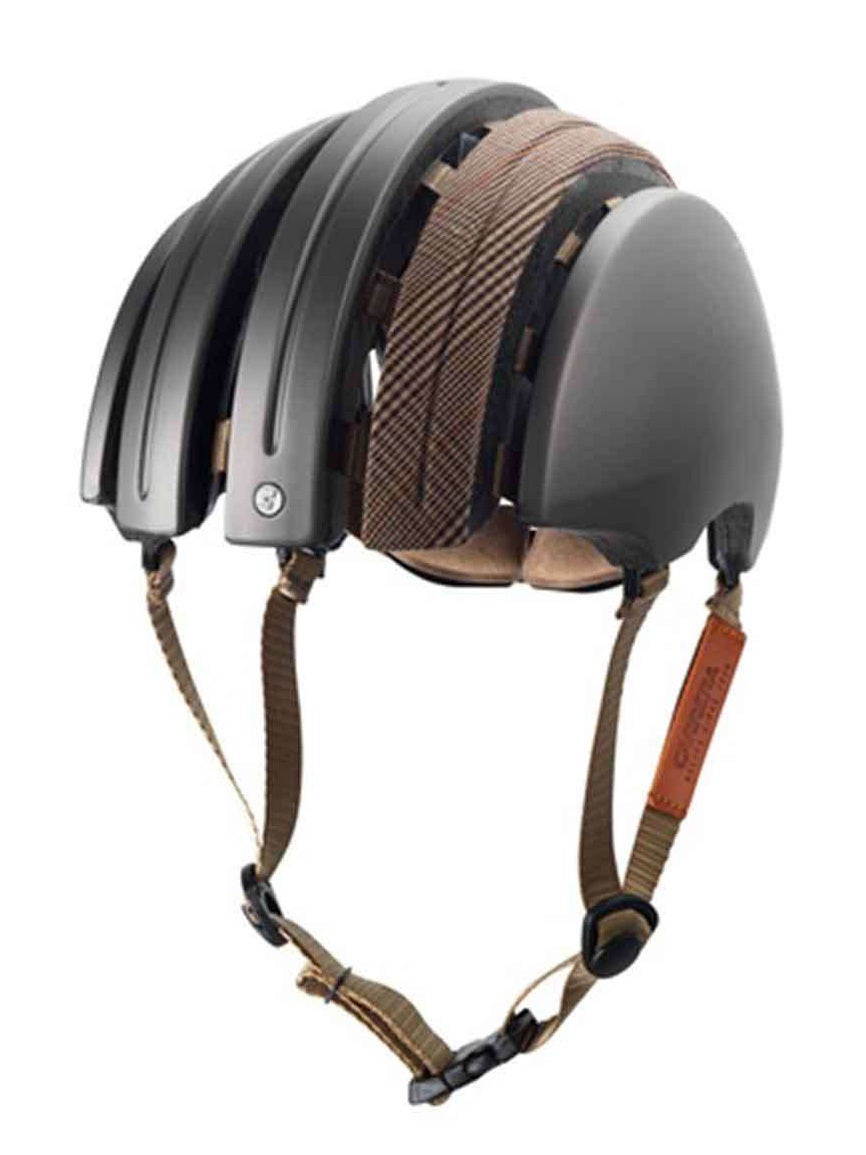 Foto: Un casco plegable, capaz de reducir el volumen de su tamaño un 25 por 100. Hecho de espuma EPS recubierta de plástico, unido por bandas de nylon. Su flexibilidad optimiza su comodidad, adaptándose rápidamente a la forma de la cabeza. Diseñado con rejillas de ventilación, para que el aire penetre fácilmente y evite la humedad. Su peso es de 330 gramos y su precio es de 140 euros (US$168).