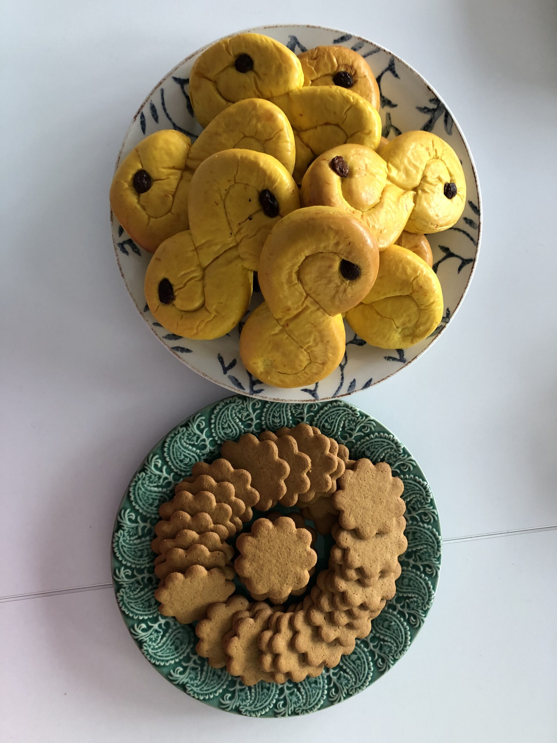 Los bollos suecos de Santa Lucía y las galletas de jengibre son muy comunes en Suecia en la temporada navideña. Los pastelillos están hechos de azafrán y para completar su característica forma se le añade una uva pasa en cada circunferencia. A diferencia de las galletas estadounidenses, las suecas son blandas, pero conservan el sabor a jengibre.