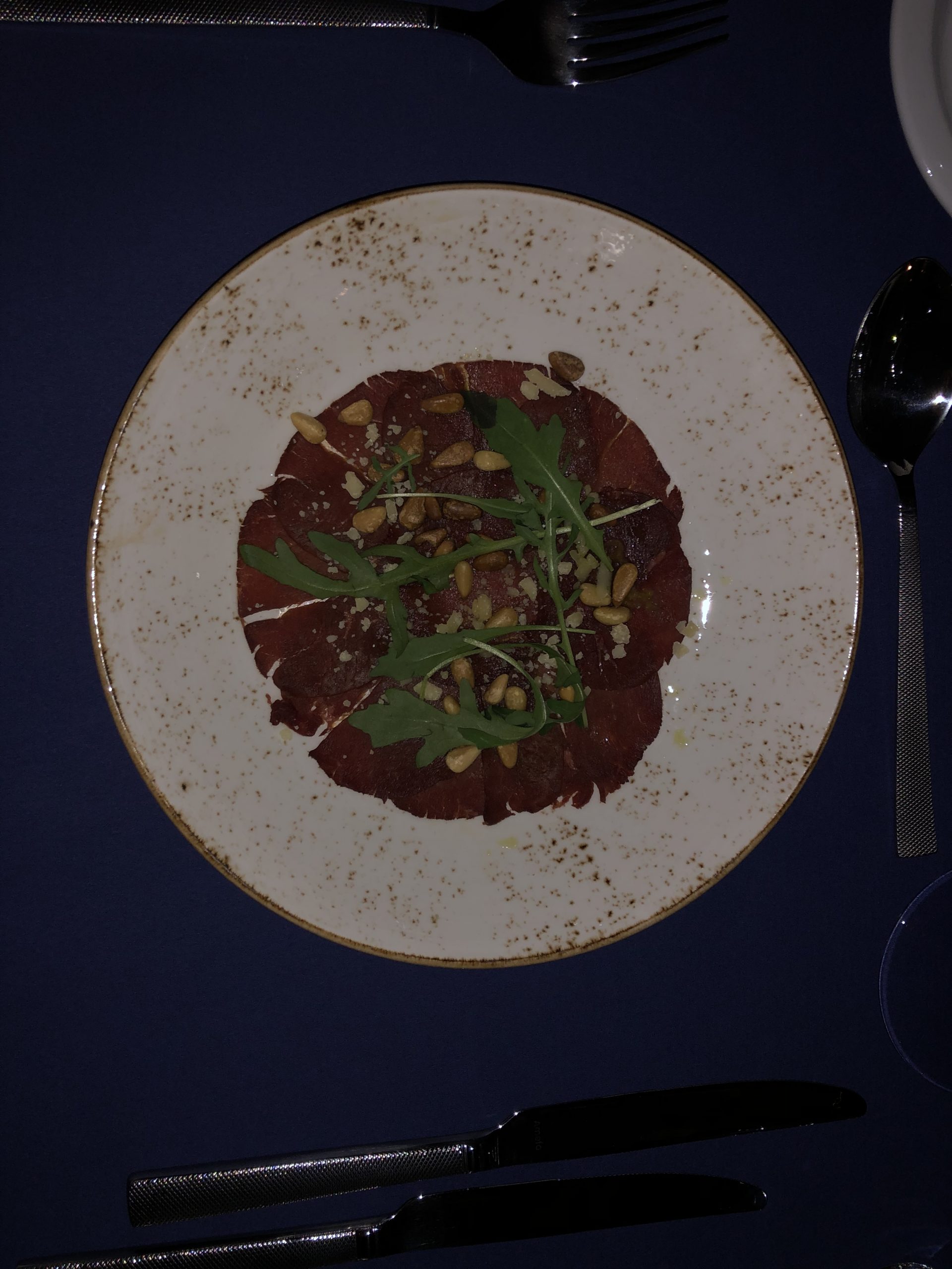 La tradición de comer carne de reno se remonta a los Sami, un pueblo indígena que habita el norte de la región escandinava, los nativos cazan los mamíferos y usan todas las partes del animal, desde su piel hasta sus cuernos. La dieta sueca incluye esta carne magra en diferentes presentaciones. En la imagen, un carpaccio de reno con nueces.