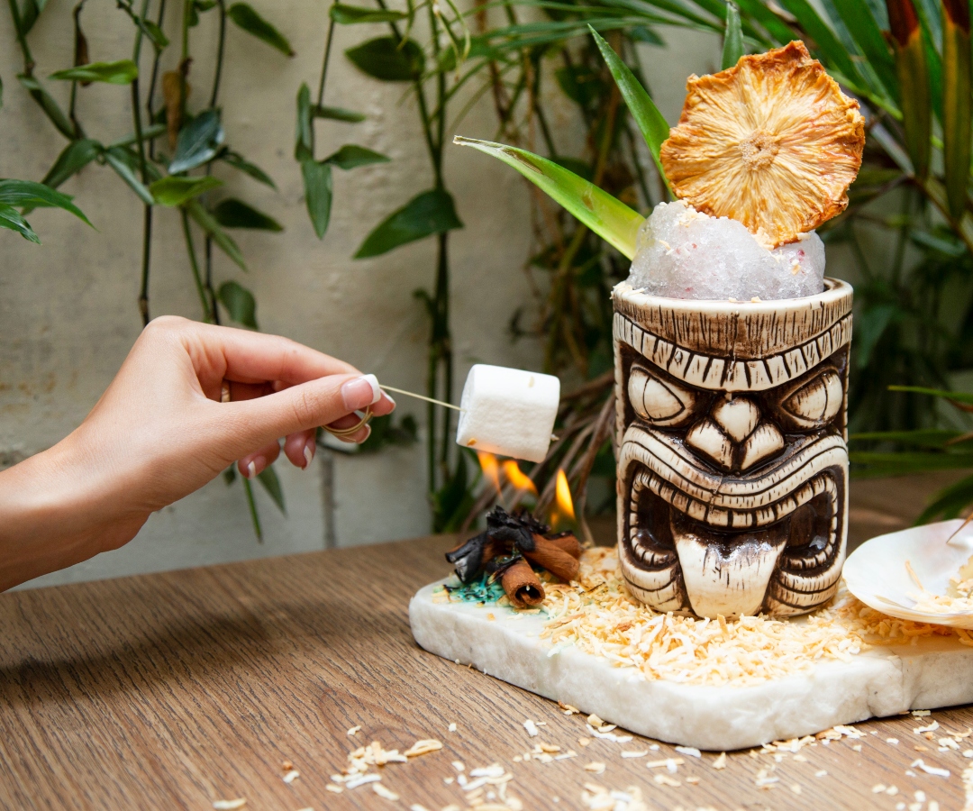 Se presenta dentro de una cabeza transparente porque activa las neuronas y despierta la curiosidad. Es un coctel de autor, con mezcal, almíbar de piña, zumo de limón, notas ligeramente picantes y ahumado con canela y romero, que rescatan las notas de esta bebida mexicana. Es toda una experiencia desde el momento en el que llega a la mesa.