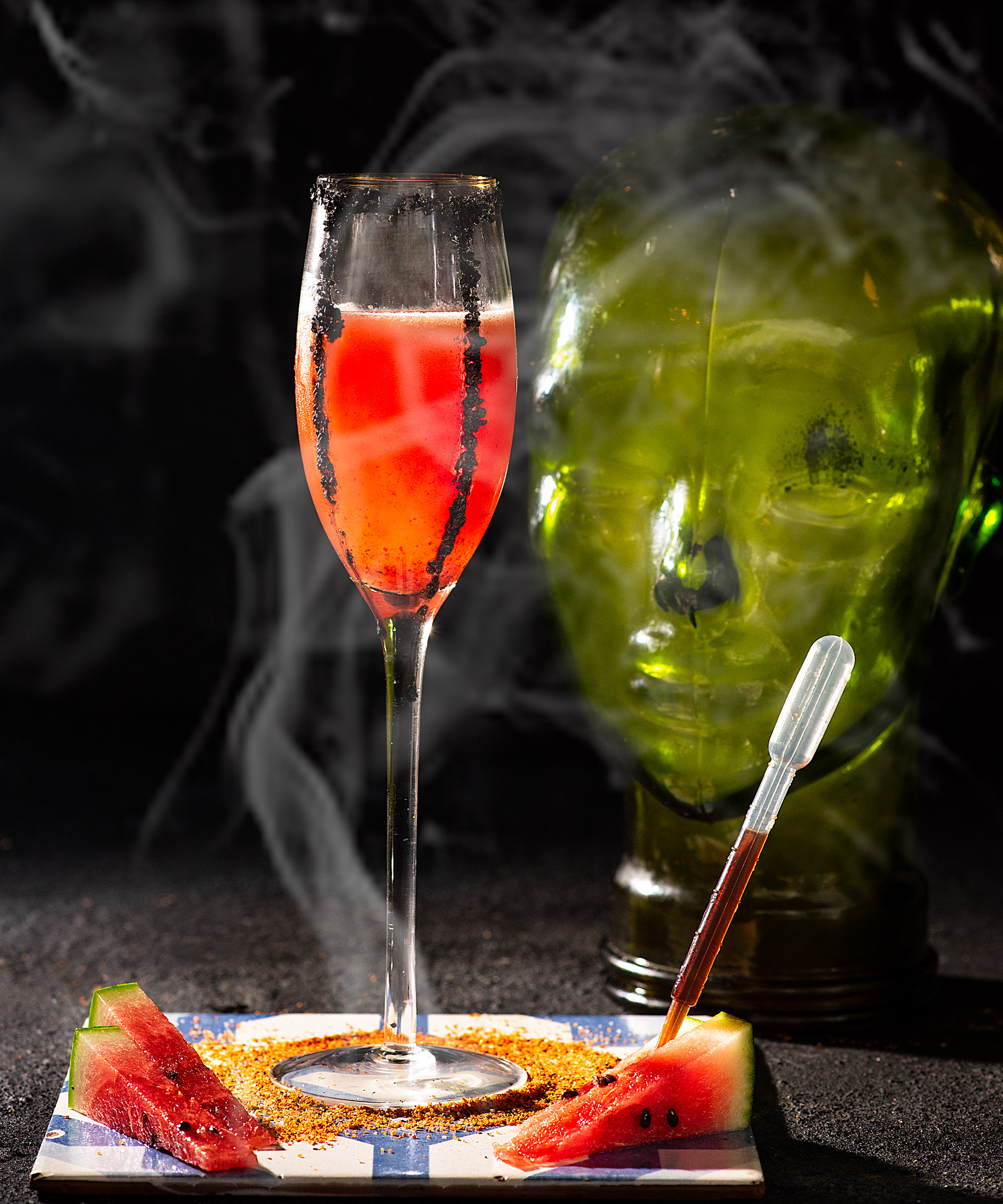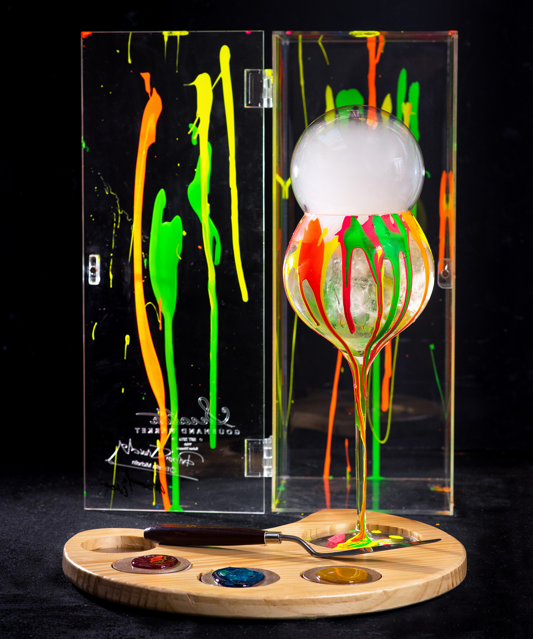 Si de estética y presentación se trata; este coctel es el que reúne todas las características de una copa con colores y toques artísticos. Esta bebida viene acompañada por tres pinturas comestibles de cítricos, herbal y levemente picante para que cada comensal, en un juego improvisado, haga de su coctel toda una creación artística.