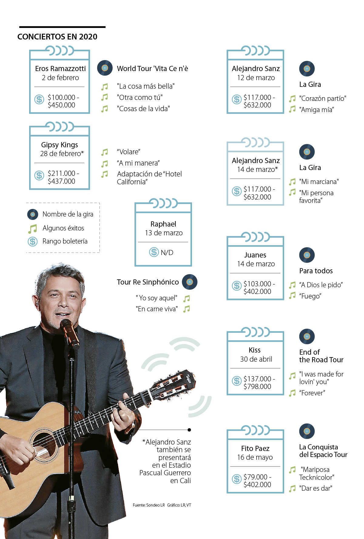 El español Alejandro Sanz es otro de los artistas que se presentará en la capital colombiana el 12 de marzo con ‘La gira’. Con este tour, visitará otros países de Latinoamérica como Perú, Chile, Ecuador y Uruguay. Sanz también estará en la capital del Valle del Cauca el 14 de marzo.