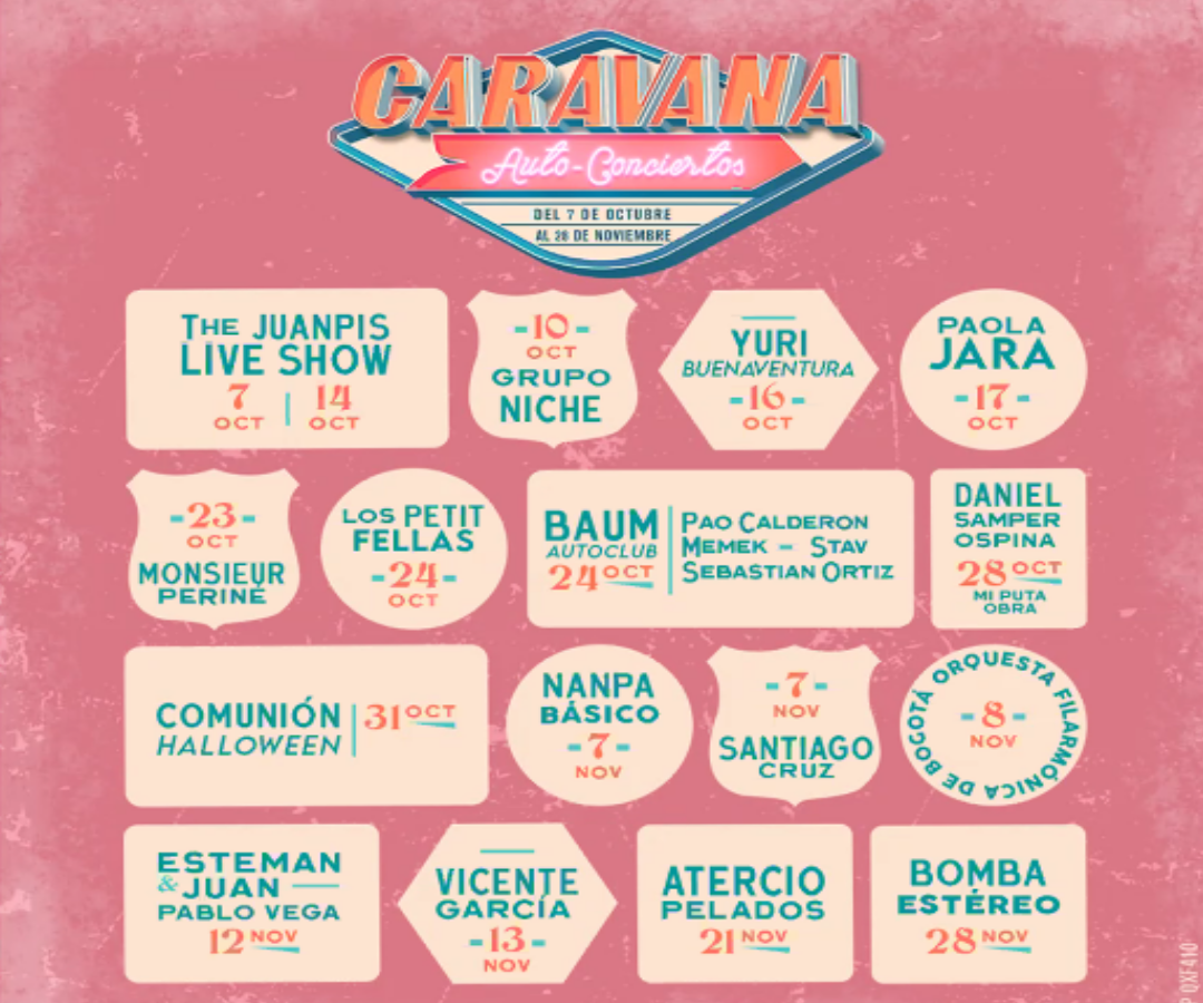 Caravana, es el escenario para el regreso de la música en vivo en Bogotá, en un ciclo de conciertos gestados por la unión de Páramo Presenta, Ocesa Colombia y Live Nation. Serán más de 20 shows de grandes artistas latinoamericanos y de diferentes ritmos y géneros los que se podrán disfrutar inicialmente entre el 7 de octubre al 28 de noviembre de 2020 en Salitre Auto parque.