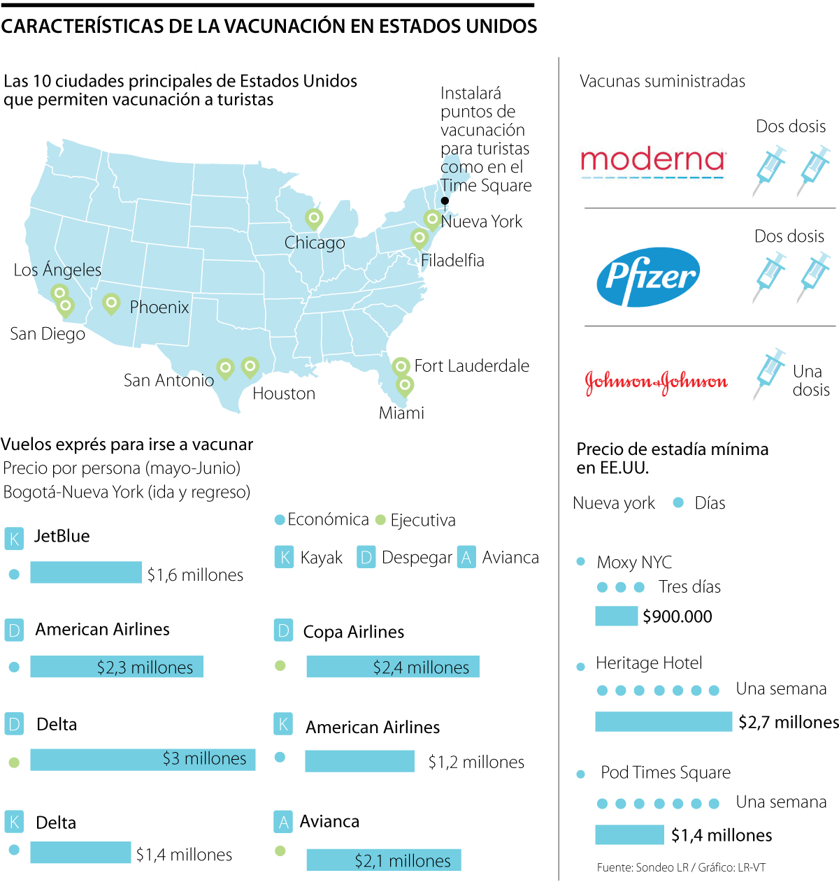 LR hizo un sondeo sobre el coto del viaje exprés a Estados Unidos, específicamente a Nueva York, saliendo desde Bogotá. Esto se hizo tomando un rango de tiempo, prudente de tres días a cuatro semanas para lograr inocularse (Ver gráfico).