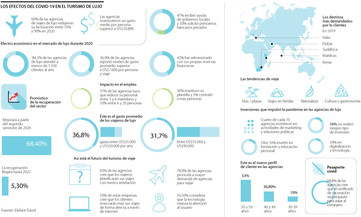 Un sector en el que, según el informe de Elefant Travel, 60% las agencias de viajes de lujo reportaron una reducción en la facturación, entre 70% y 90% durante 2020.