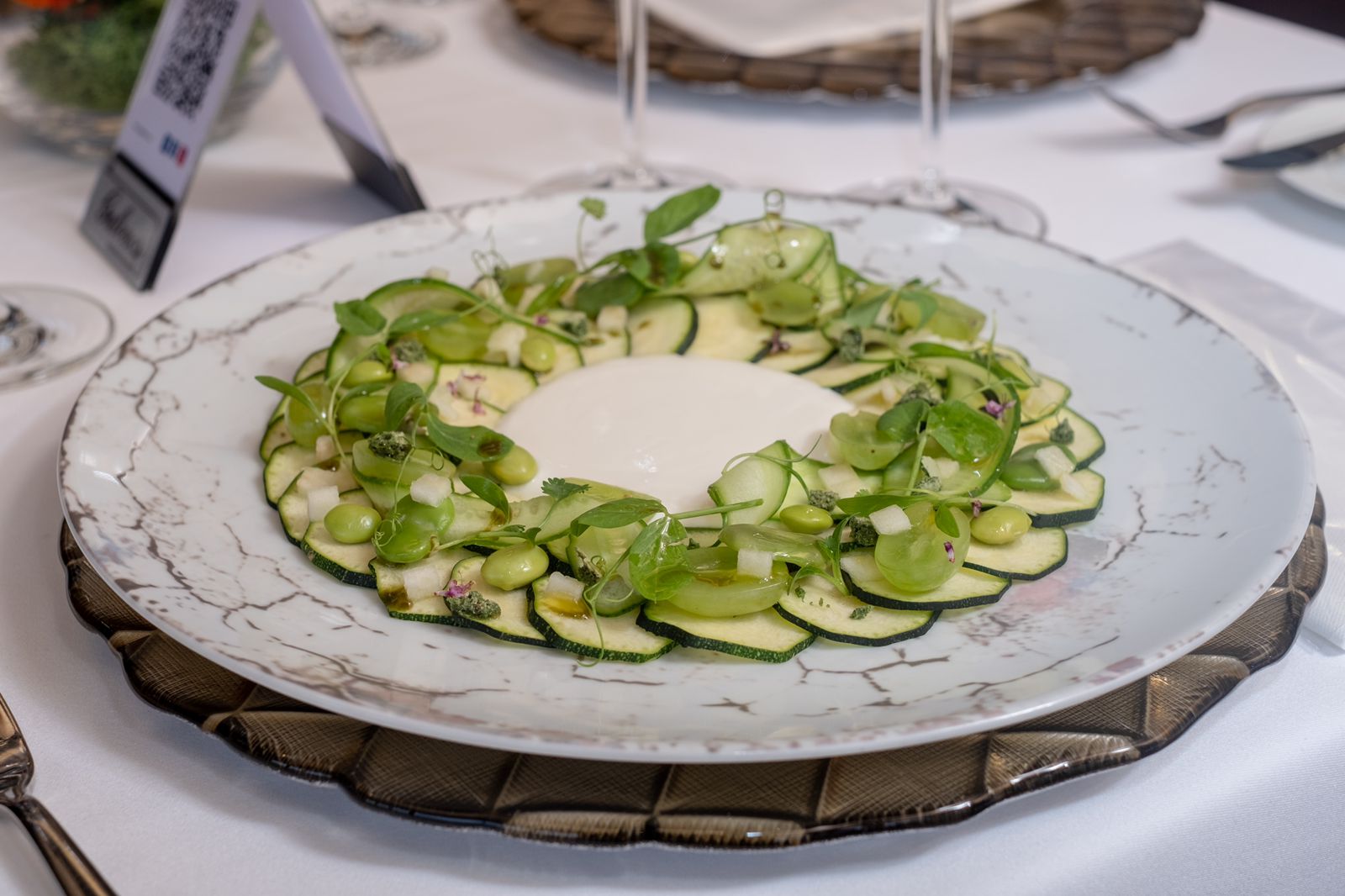 Este plato recomendado utiliza el carpaccio y las hortalizas verdes, miel artesanal de limón, macarrones de pistacho y yogurt simbiótico. La propuesta está inspirada en las estaciones tropicales.