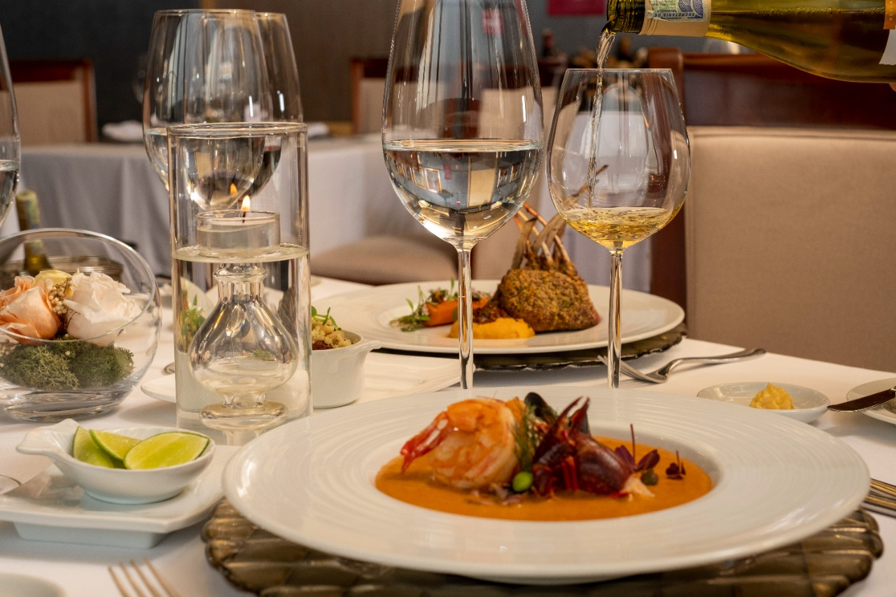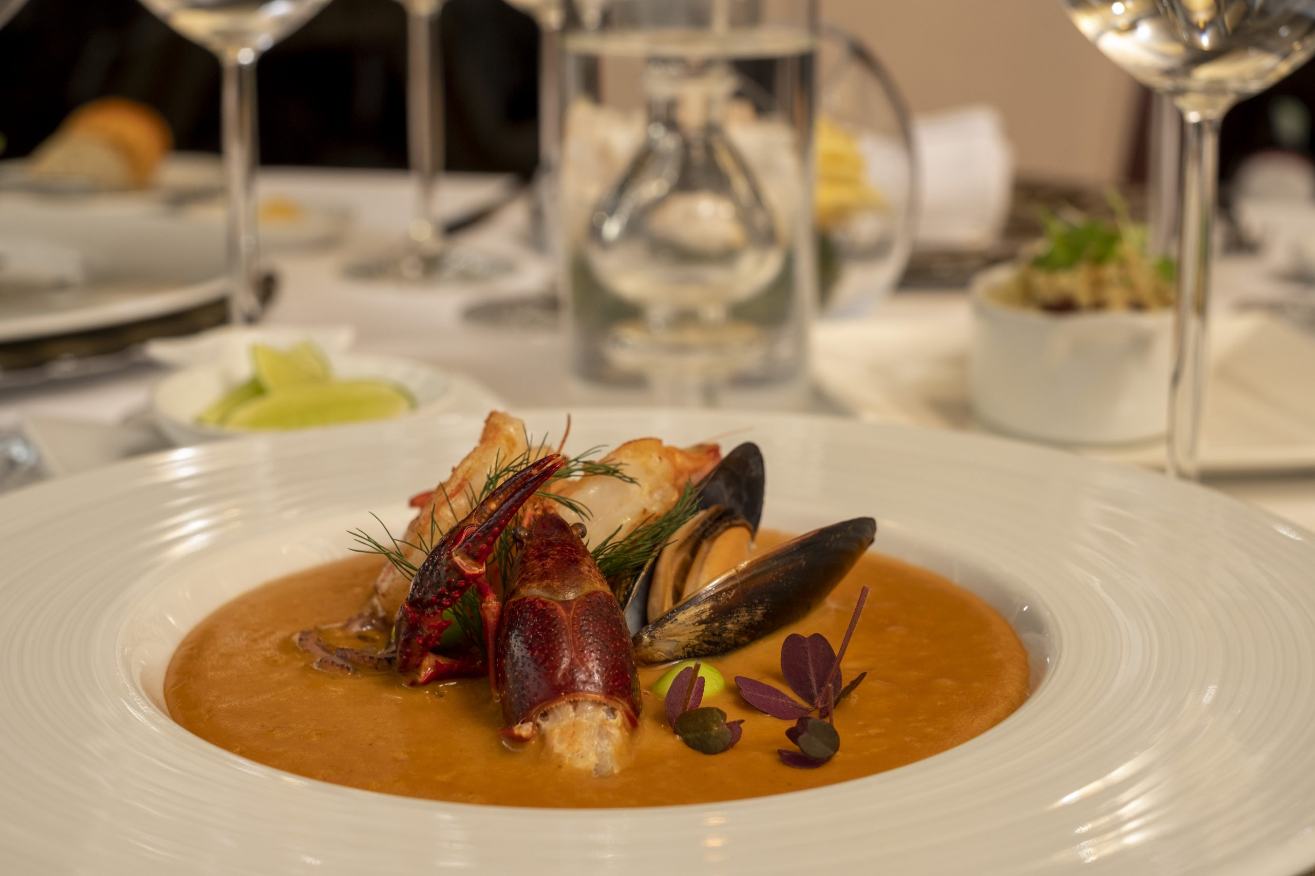 El mar toma el protagonismo y con él y el chef logra un sabor intenso y sofisticado. Contiene salsa velouté en aromas de eneldo y los frutos del mar son flambeados en brandy.