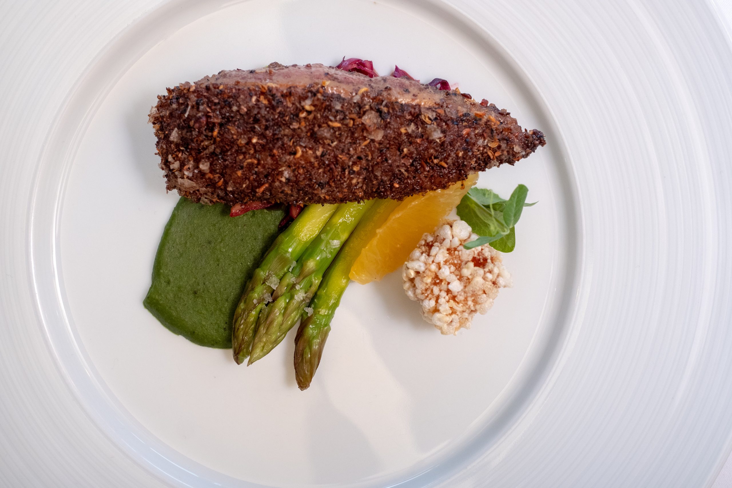 Con la técnica de ahumado en frío usando leñas como fresno, se incluye pimienta de origen chino sobre col morada con barbacoa y crema de habas. Se inspira en tradiciones asiáticas.