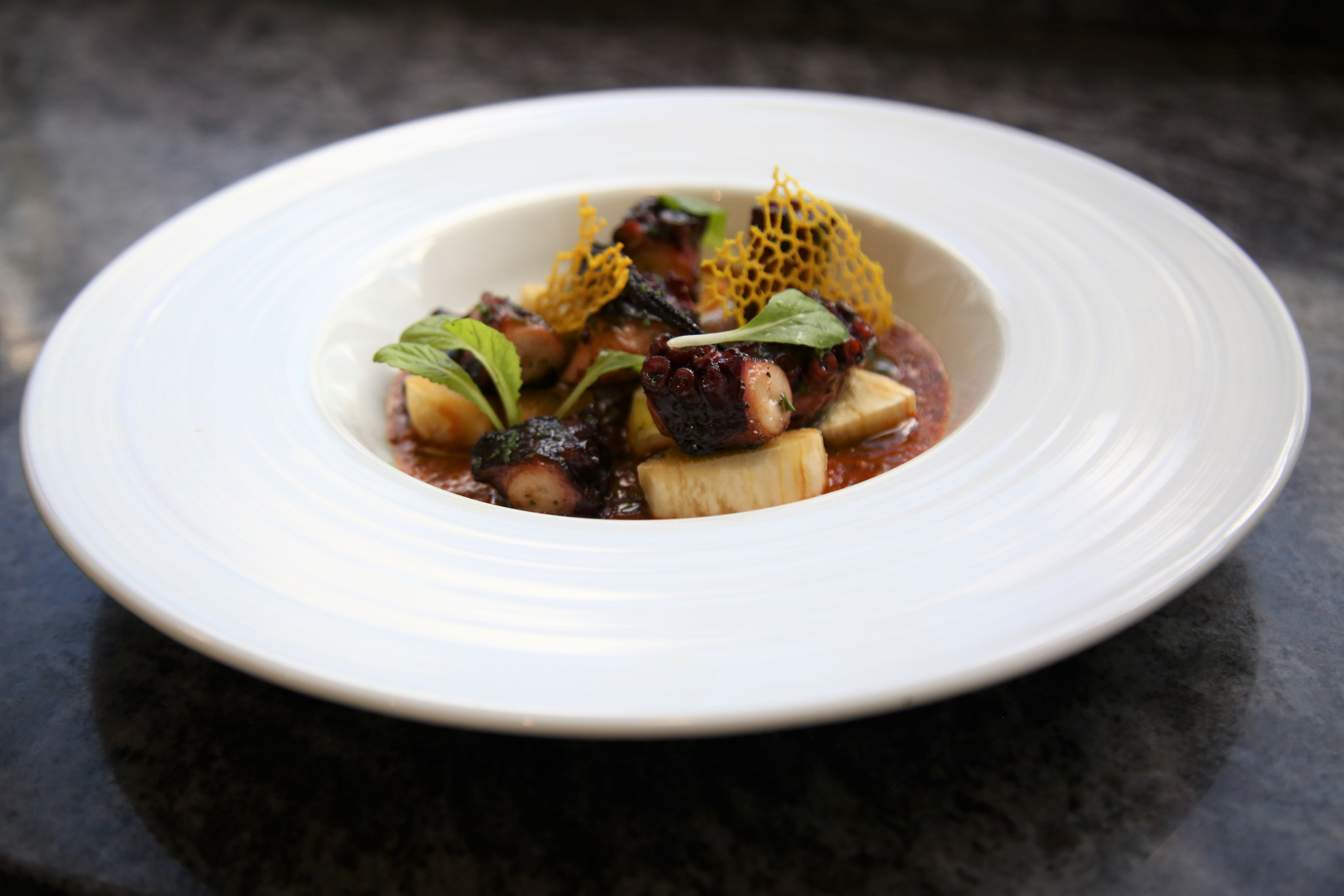 Uno de los favoritos. Trocitos de pulpo a la parrilla sobre salsa de ajíes con yuquitas crocantes.