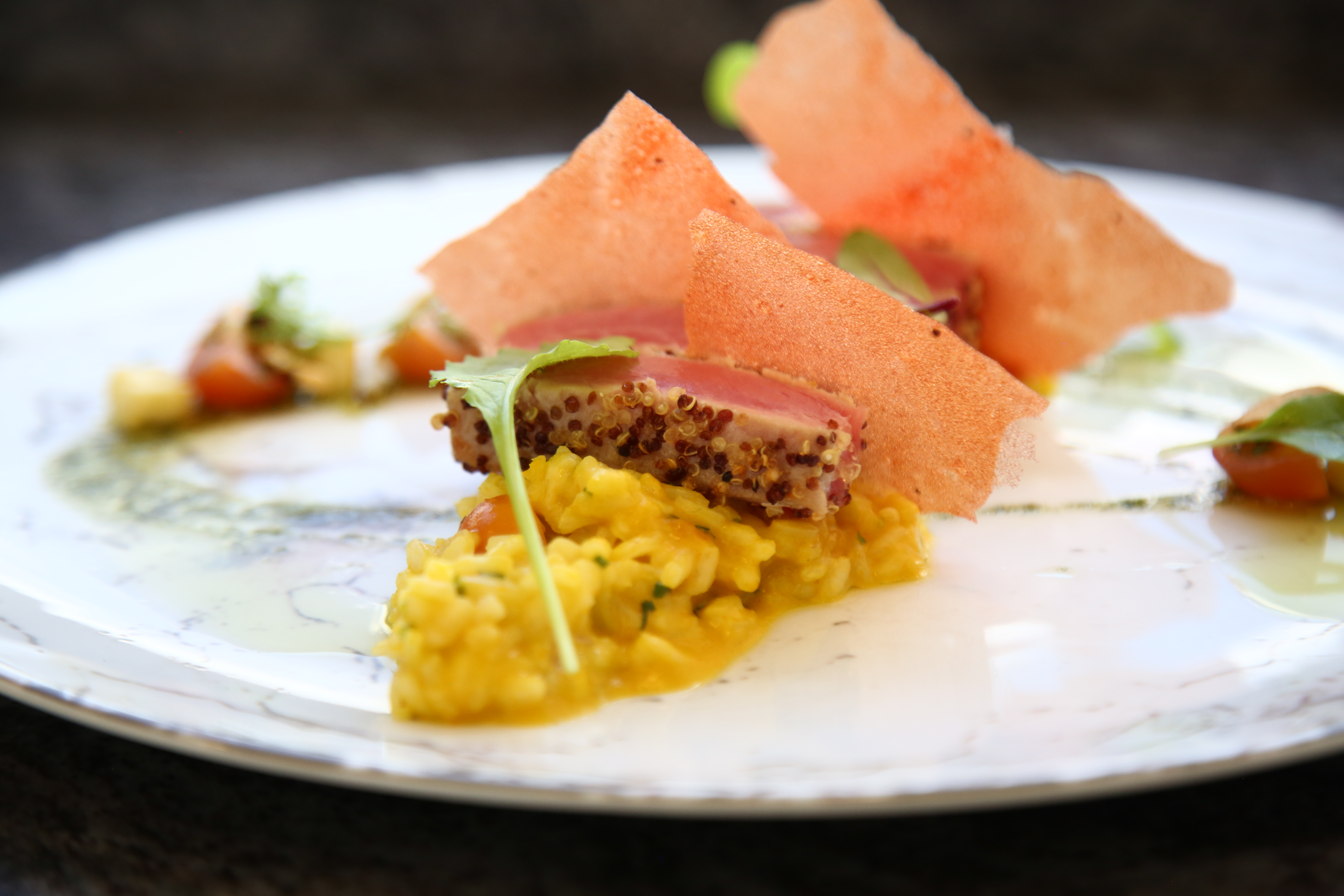 Atún rojo en costra de quinua sobre risotto de ají amarillo, espárragos, tomatillos y sal de flor de ajo.