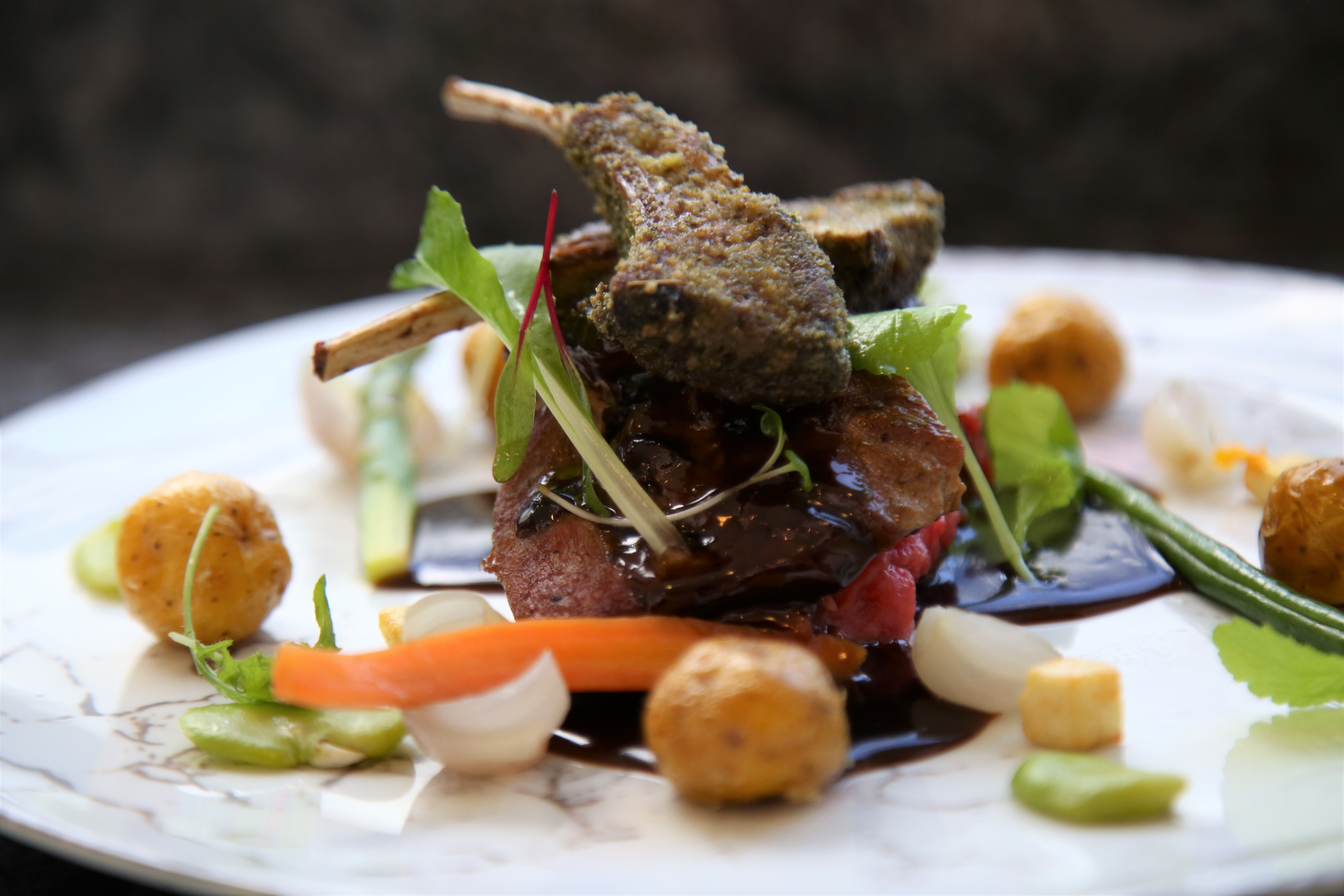 Rack en costra de moringa y lomo al horno bañado en reducción de miel y ron de caña.