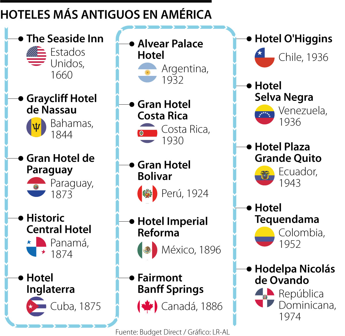 La revista Budget Direct se basó en las plataforma Historic Hotels of Europe e Historic Hotels.org para encontrar el primer hotel que se fundó en cada país del mundo, y además de esto, resaltar los que lideran por su alto número de reservas.