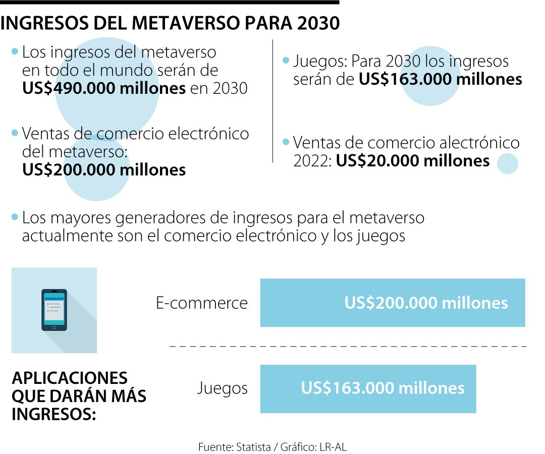 Para las ventas de comercio electrónico en el metaverso, por ejemplo, Statista proyecta un crecimiento a más de US$200.000 millones para 2030, mientras que en la actualidad genera cifras de US$20.000 millones.