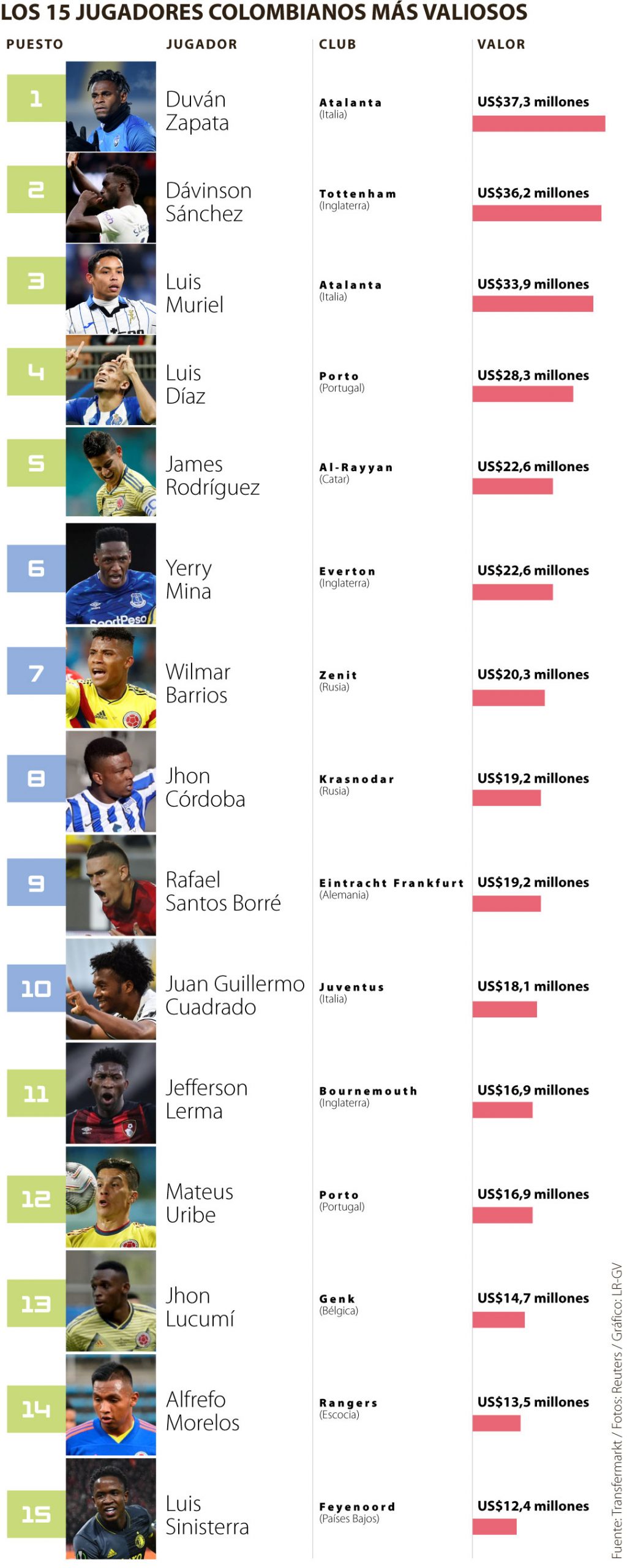 Zapata es seguido en la lista por el defensa de Tottenham Hotspur de Inglaterra, Dávinson Sánchez, con un valor en el mercado de 32 millones de euros (US$36,2 millones). Es titular en el equipo de Antonio Conte, que actualmente marcha quinto en la Premier League a seis puntos del Arsenal.