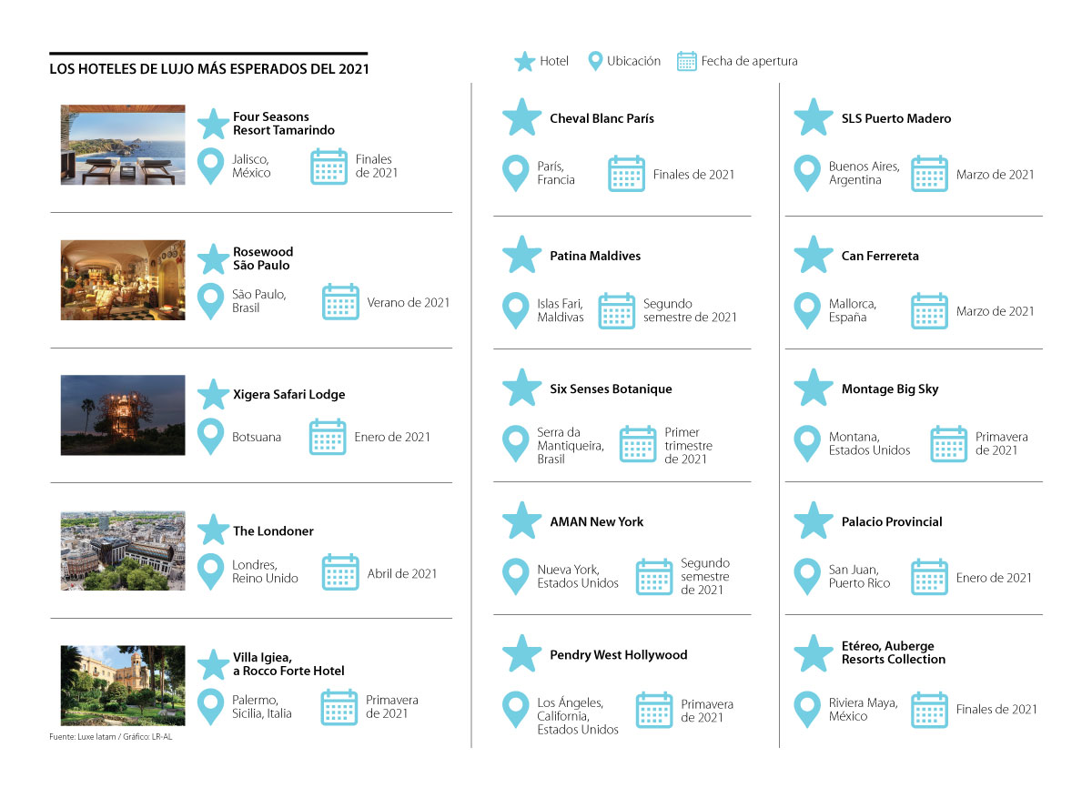 Es por esto que varios hoteles no frenaron sus planes de construcción y ya se están conociendo las fechas y ubicaciones de las aperturas más lujosas en la hotelería internacional, en las que Luxe Latam resaltó hoteles en las principales capitales del mundo y otros en zonas rurales, ideales para desconectarse por completo del mundo laboral.