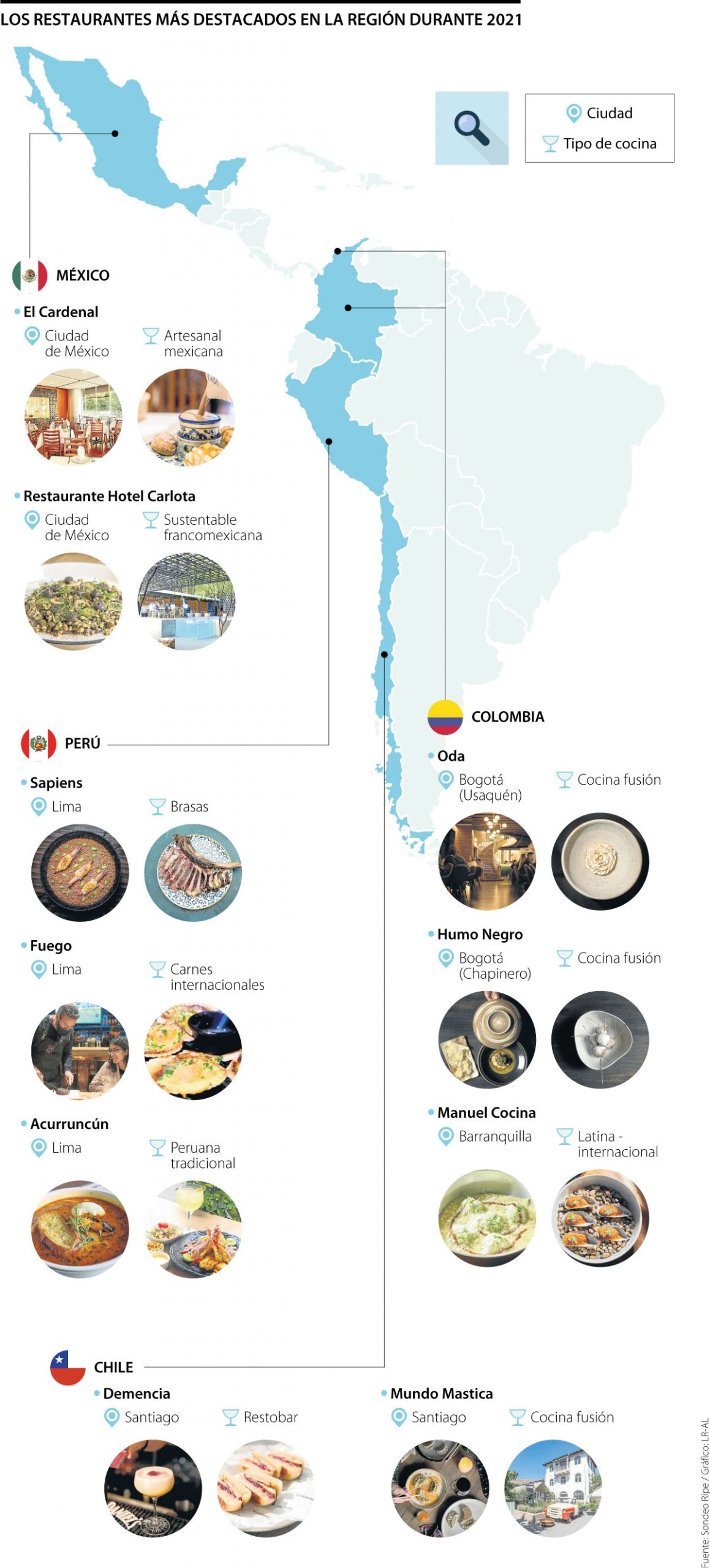 ¿Qué restaurante me recomienda?, es una pregunta común entre conversaciones de amigos. Por eso, LR de Colombia, Diario Financiero de Chile, El Economista de México, y Gestión de Perú, medios de la alianza de la Red Iberoamericana de Periodismo Económico (Ripe), resaltan algunas de las cocinas que más noticias generaron en América Latina o que estuvieron en el top de los buscadores de reservas durante este año; ahora, son una oportunidad para explorar algún fin de semana de 2022.