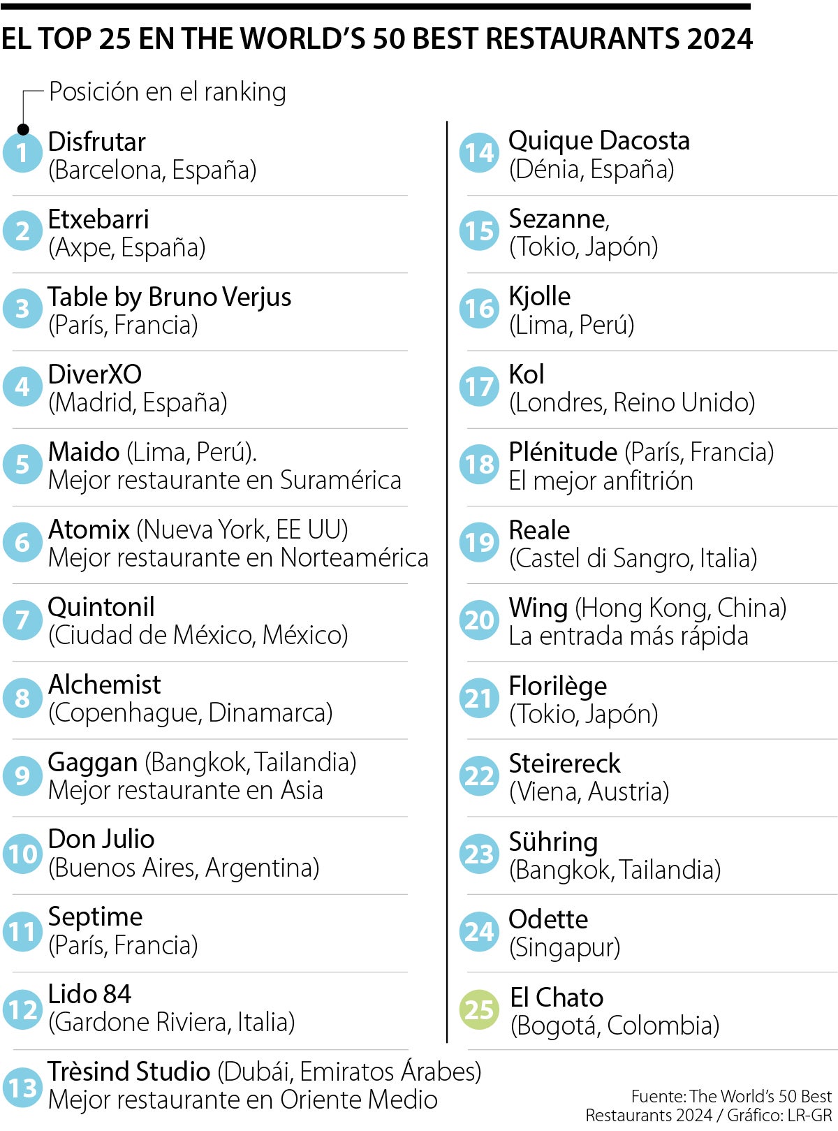 Este año, el primer puesto se quedó en Europa; el título se lo llevó el restaurante Disfrutar, ubicado en Barcelona, España. A este le siguió Etxebarri, también en España, localizado en el País Vasco.