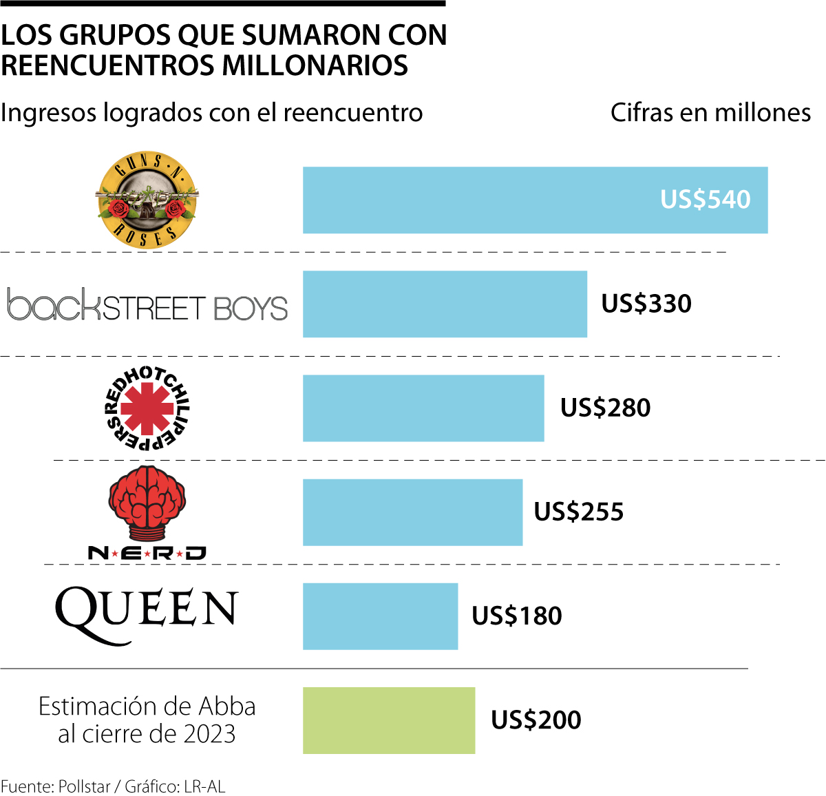 Y así como se calcula que el reencuentro de Abba moverá hasta 2023 entre derechos de explotación de música y posibles eventos en vivo cerca de US$200 millones, otras agrupaciones han aprovechado la palabra “volver” para hacer giras que dejan fuertes ingresos.