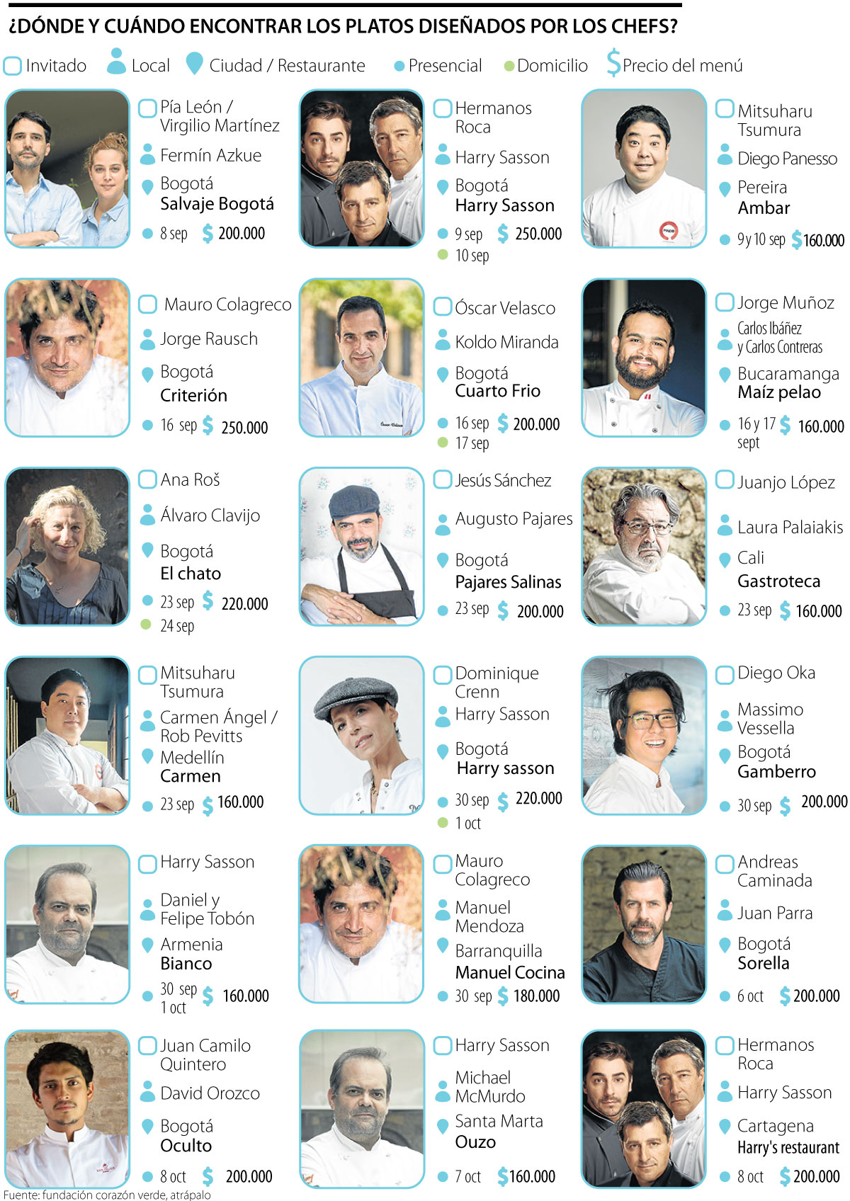 Se lleva a cabo en prestigiosos restaurantes de Bogotá, Medellín, Cali, Barranquilla, Cartagena, Bucaramanga, Pereira, Armenia y Santa Marta; y la dinámica funciona con un chef local como Diego Panesso, Jorge Rausch o Koldo Miranda, que prepararán un menú de cuatro pasos, y maridado, que ha diseñado de la mano de un chef invitado para mostrar su estilo gastronómico de tal forma que quien lo deguste “viva la experiencia como si estuviera probando en el restaurante de cada uno de los cocineros invitados en estas ciudades en donde ellos tienen su cocina”, explicó Cristina Botero, presidenta de la Fundación organizadora.