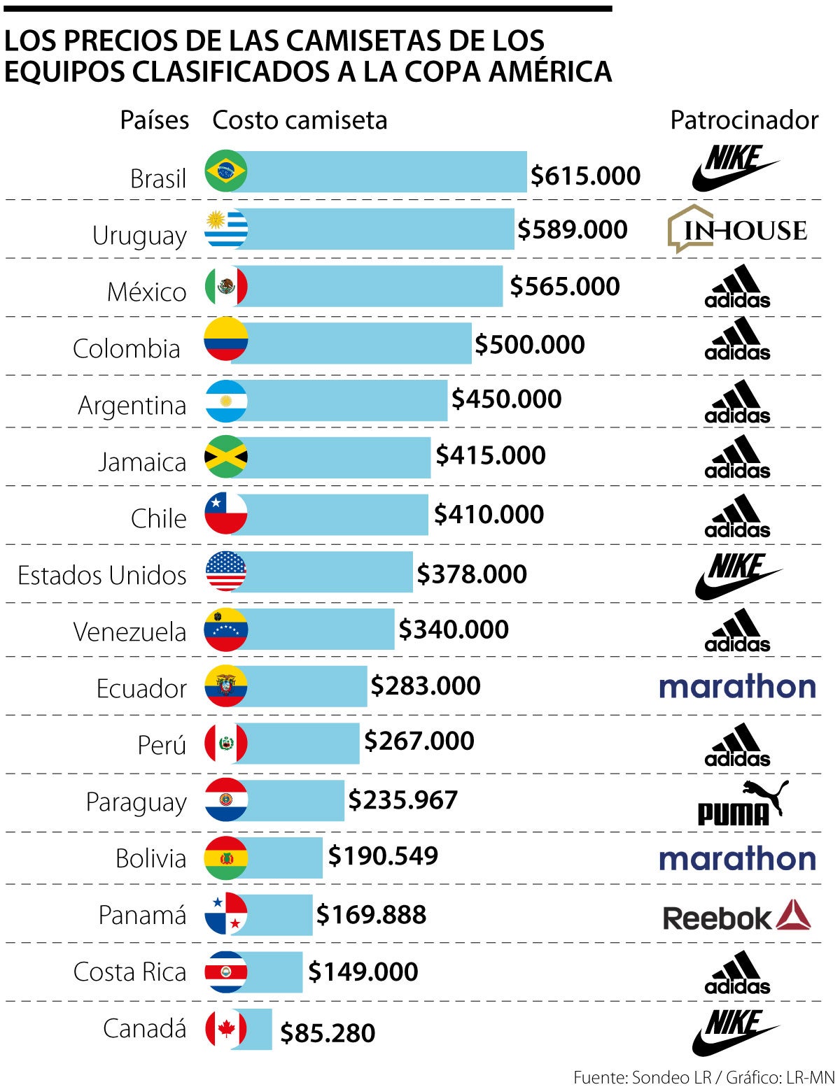 Pero la camiseta más costosa la tiene la de Brasil, que está en $615.000. Luego siguen las de Uruguay, México, Argentina, Chile, Perú, Costa Rica y Venezuela; con precios que oscilan entre $85.000 hasta el valor de la camiseta brasileña.